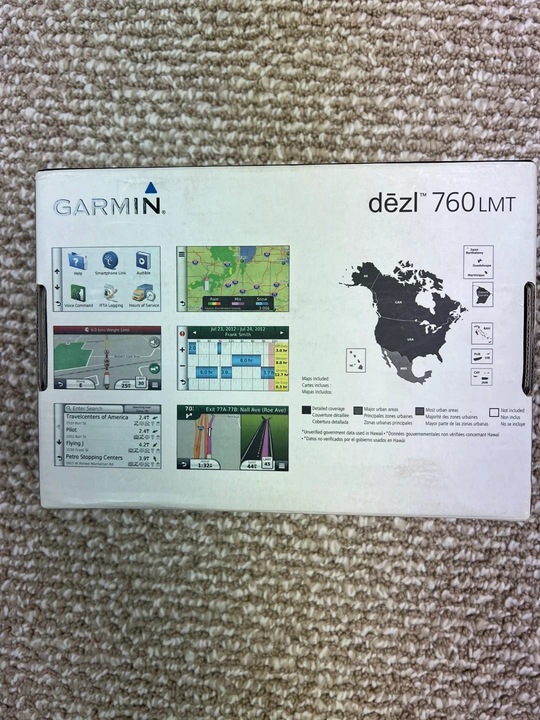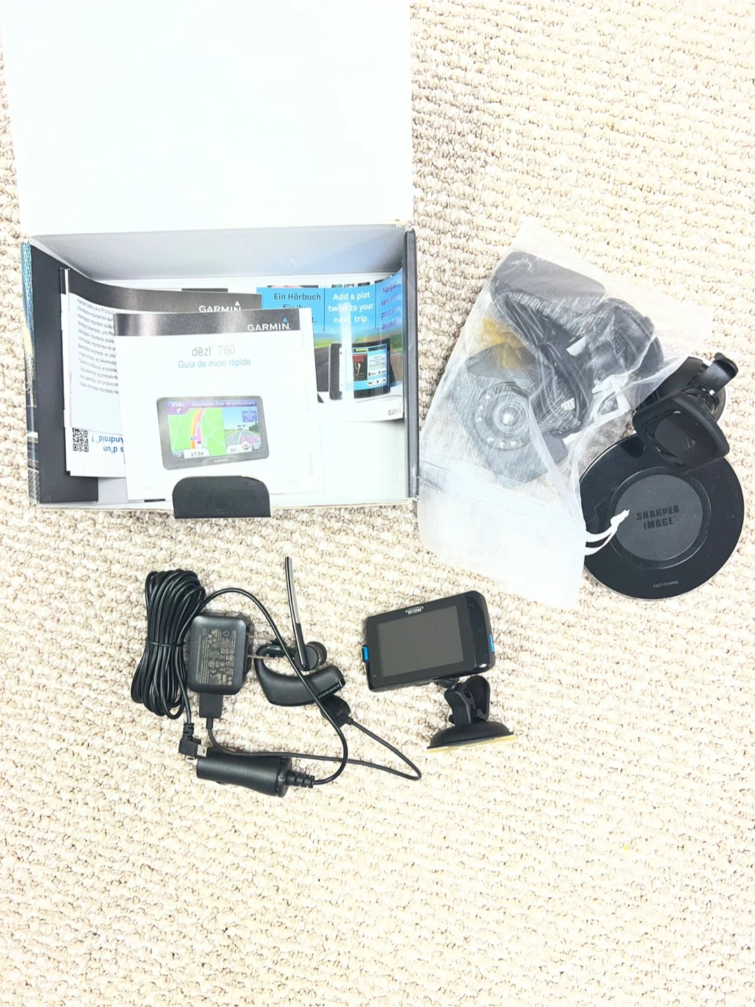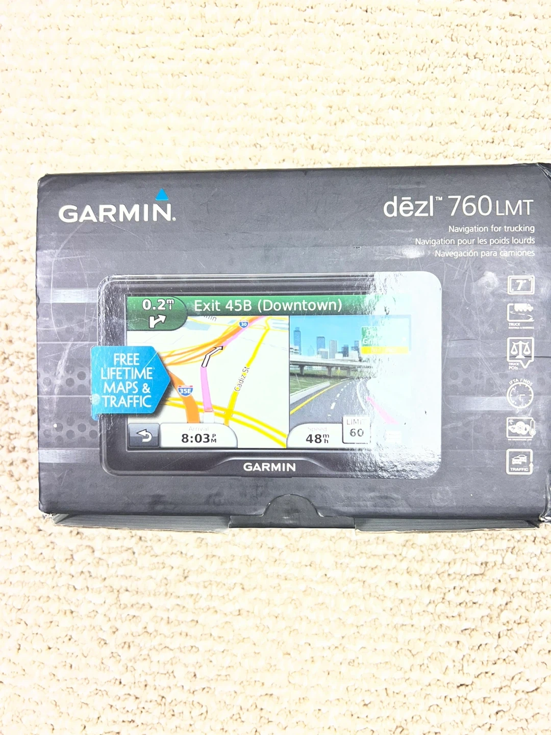Selling a Garmin dezl 760LMT GPS navigator! It features a large 7" high-resolution touchscreen display and truck profiles with truck-specific routing. Active Lane Guidance helps you stay in the correct lane. The box and all components are included: mount, charger, and instructions