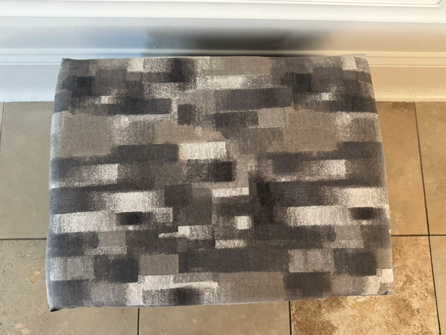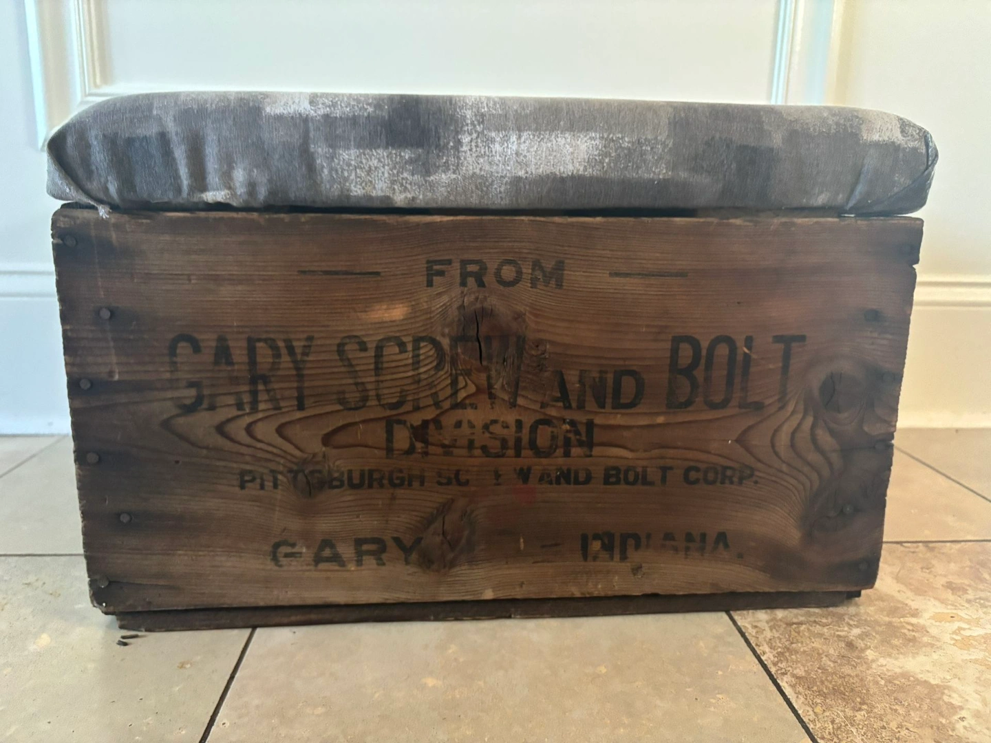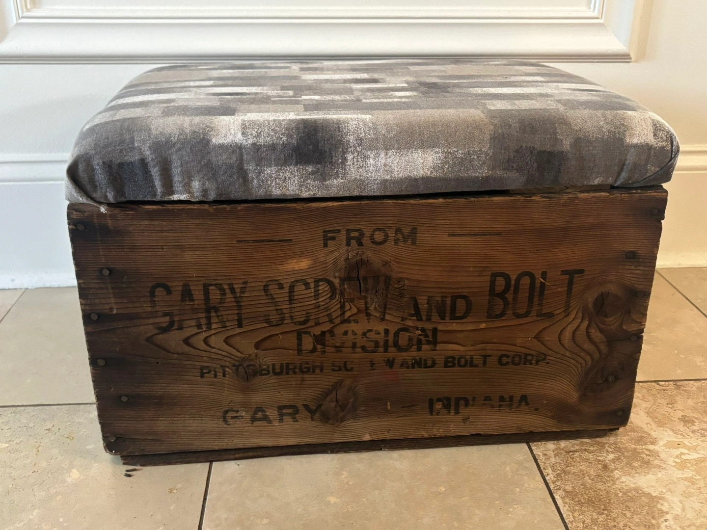 10Upcycled Gary Screw and Bolt crate/footstool. Plenty of storage with a beautifully reupholstered gray pattern top. Perfect for resting your feet in any family room or living room. A wonderful rustic piece Measurements are 20”w x 13”h x 14 1/2”d
