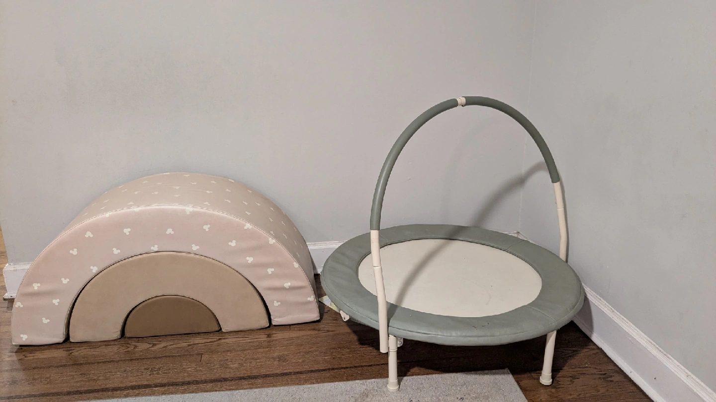 44Your kid(s) will love these toys. The stackable arch's are great for pretend play and active play. Use them as a rocking chair or a comfortable space to lay down to read. Also great for jumping since they are made with durable foam. The exterior material is easy to clean. The trampoline is great for very active kids specially with the winter approaching. Have your kid drain some energy with a jumping session or use as a confortable space to lay down and rest after a long day. Overall great additions to any kids routine. Our kids love them and use them almost everyday but unfortunately we are moving and can't take them with us. Important: available for pick up from November 15. Looking to seel both toys but open to offer for each product. Arch: 150$ trampoline: 90$. all together a great deal of 180$.