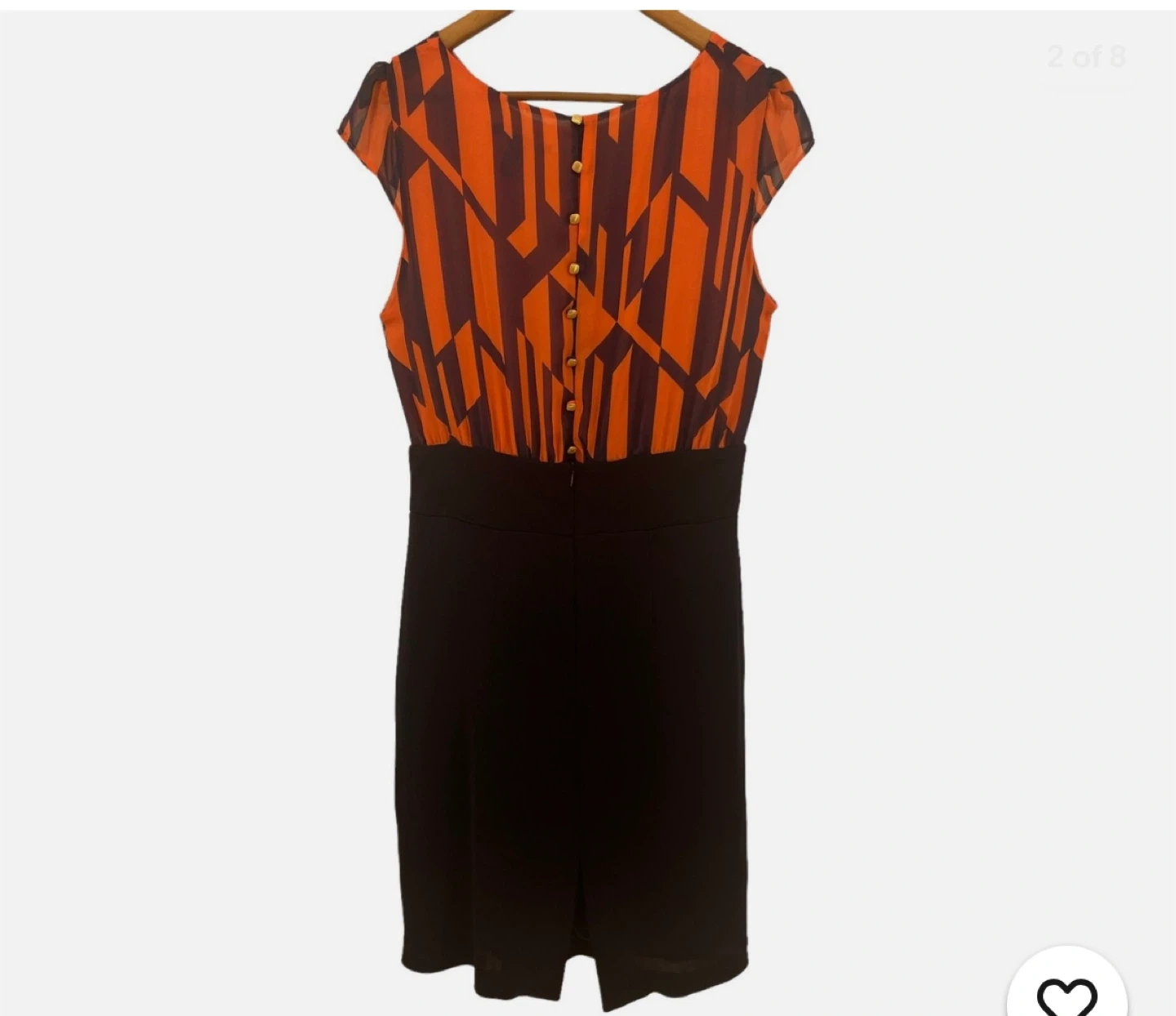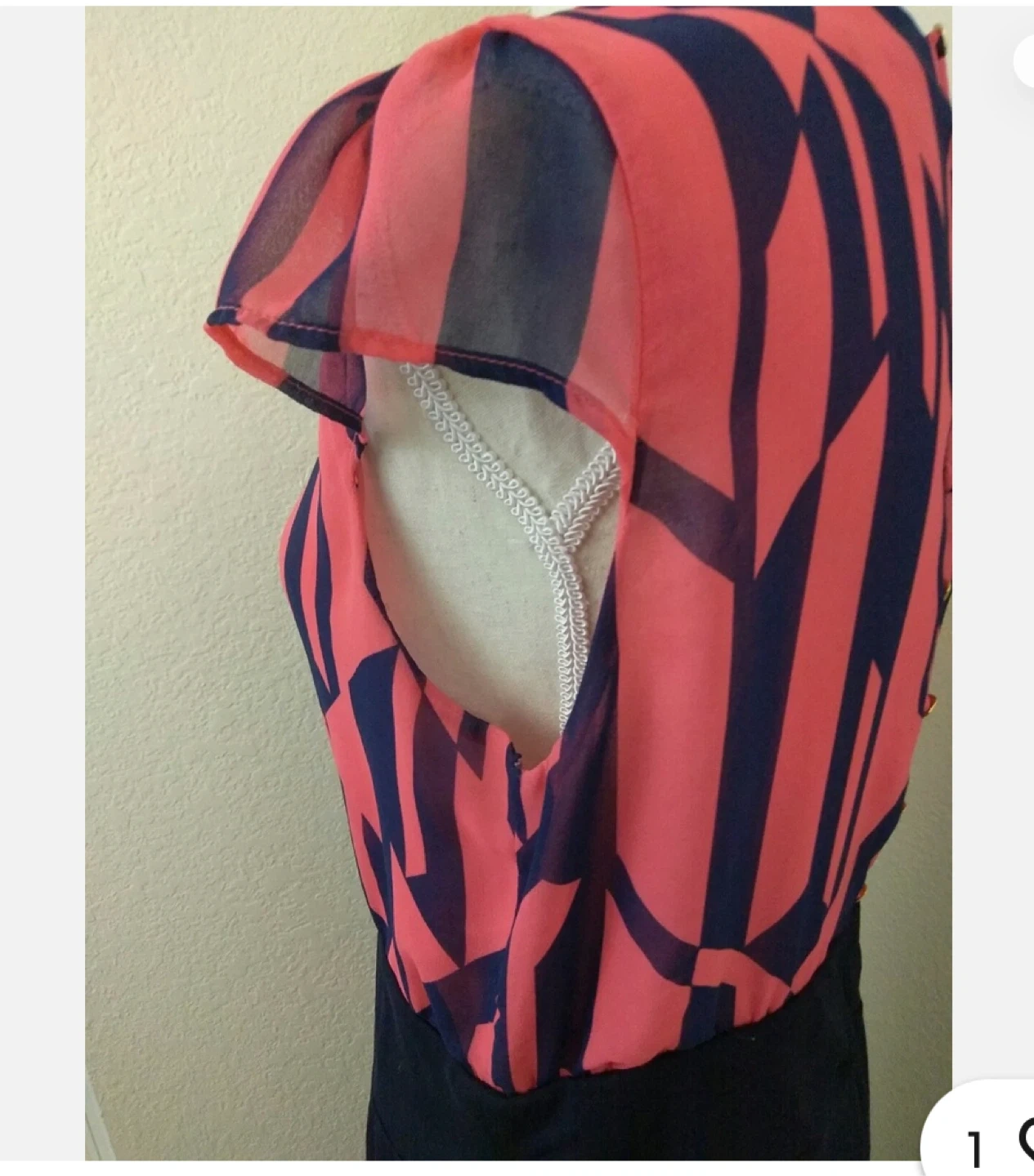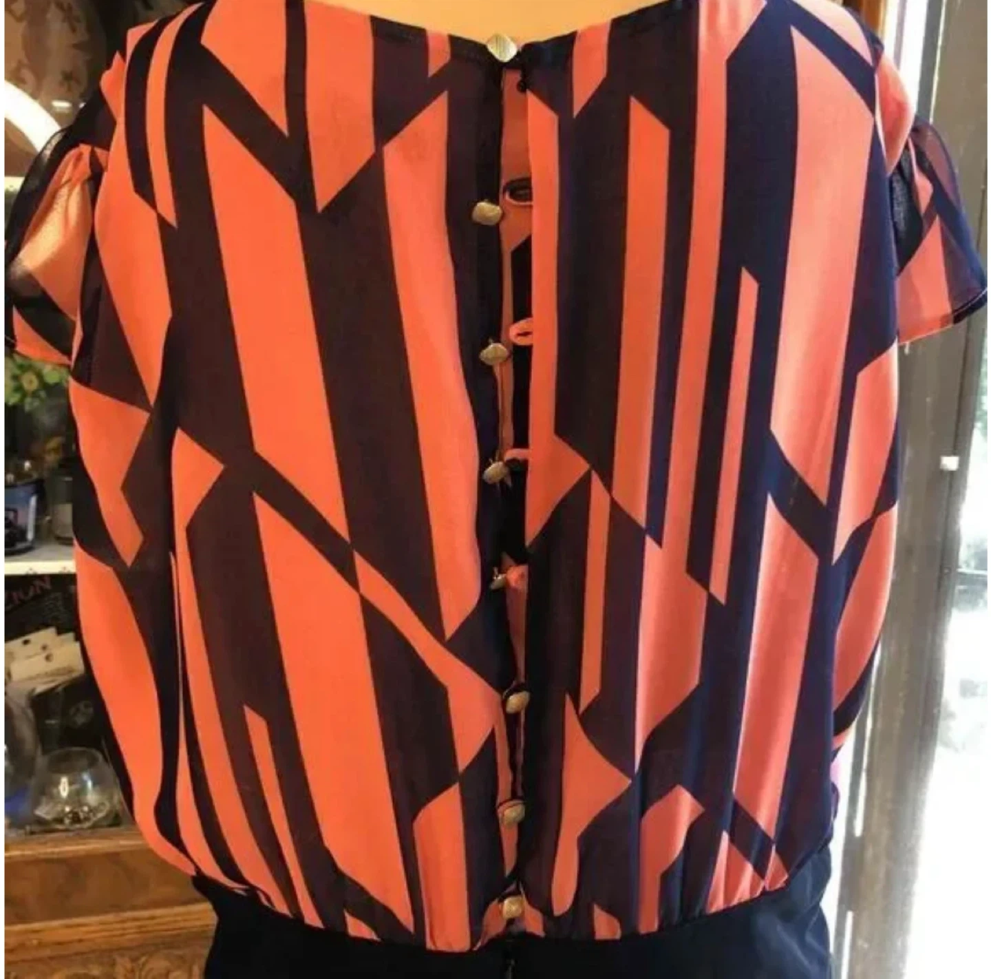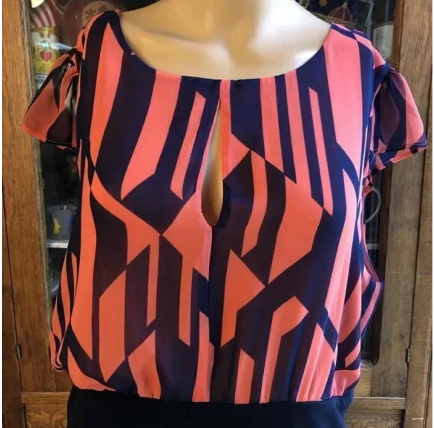 Coral and navy geometric print dress by MNG by Mango. Short flutter sleeves and a keyhole neckline. It has a button-up back. Size XS.