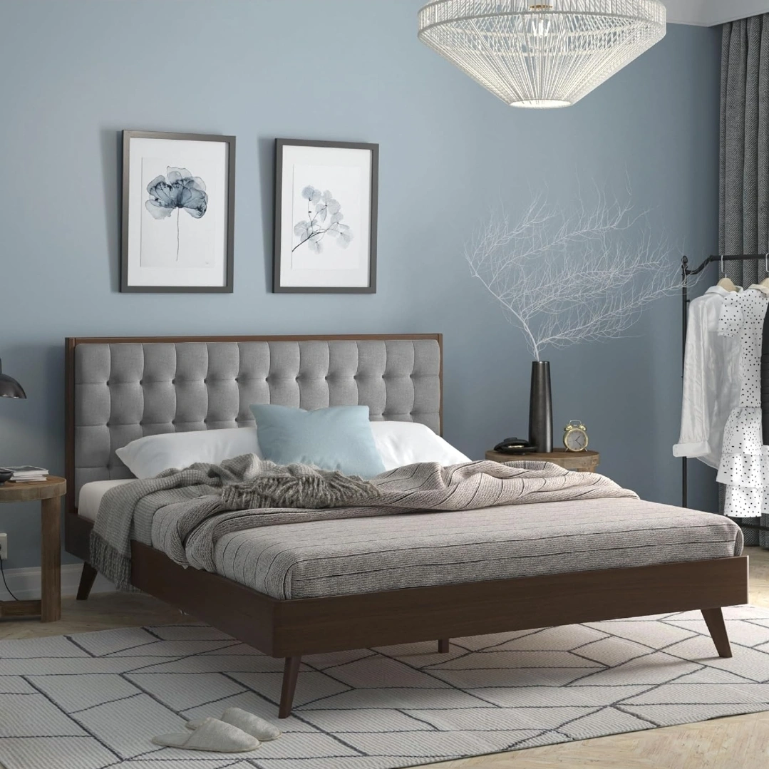 Bed Frame: Mid Century Modern Solid Wood Queen Size Bed Frame – Gray Fabric Upholstered Wooden Platform Bed Frame with Slats – No Box Spring Needed. Originally $600