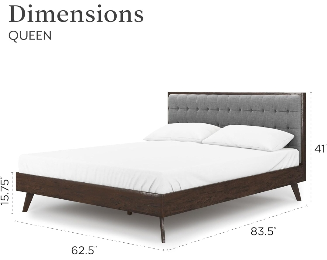 Bed Frame: Mid Century Modern Solid Wood Queen Size Bed Frame – Gray Fabric Upholstered Wooden Platform Bed Frame with Slats – No Box Spring Needed. Originally $600