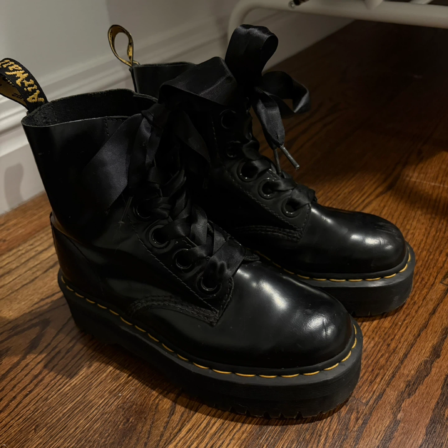 These Dr. Martens boots are black with a platform sole. They feature satin ribbon laces for a unique look. Made from smooth leather.