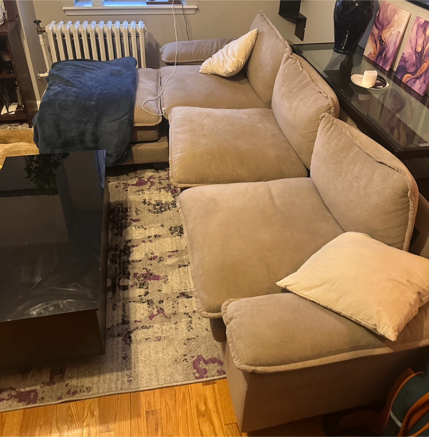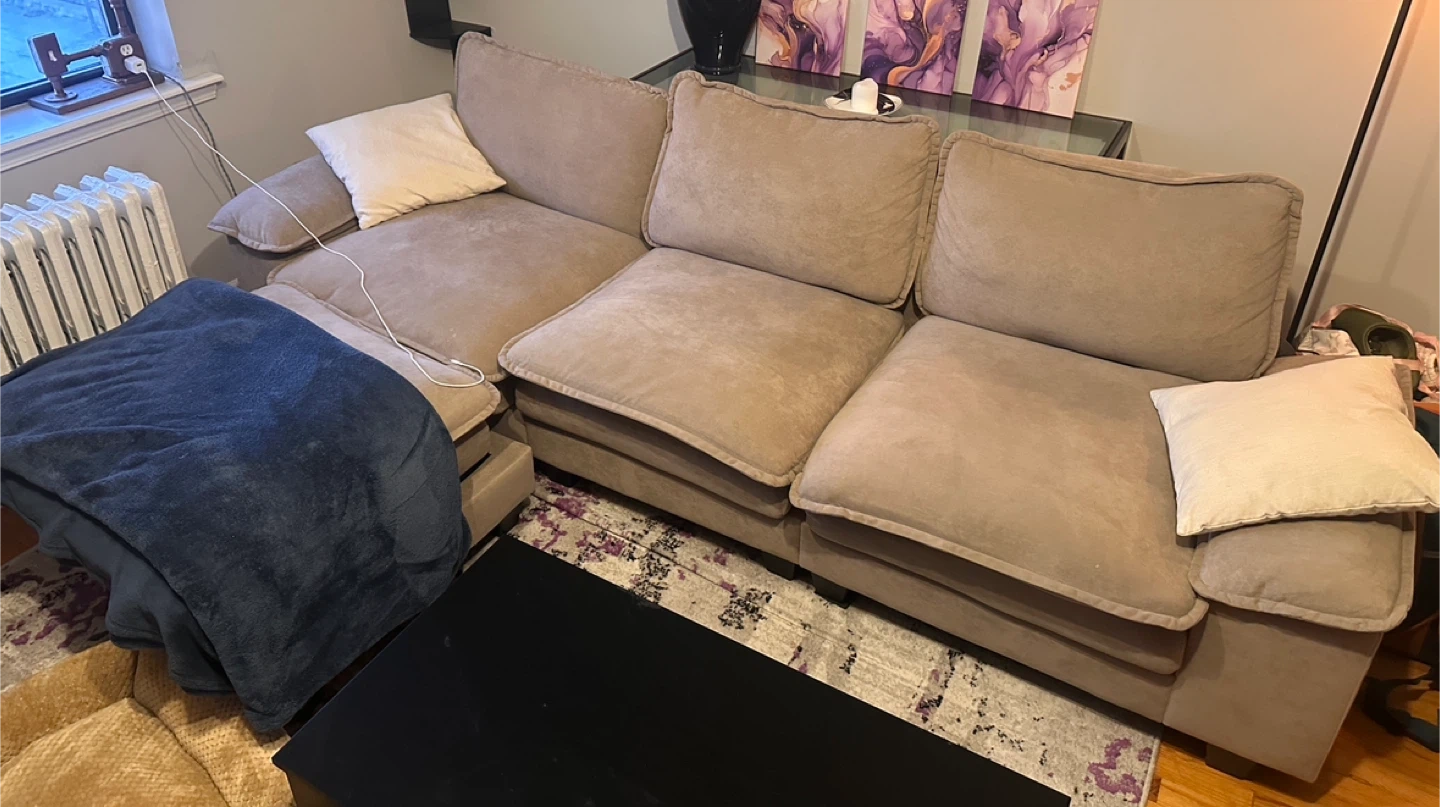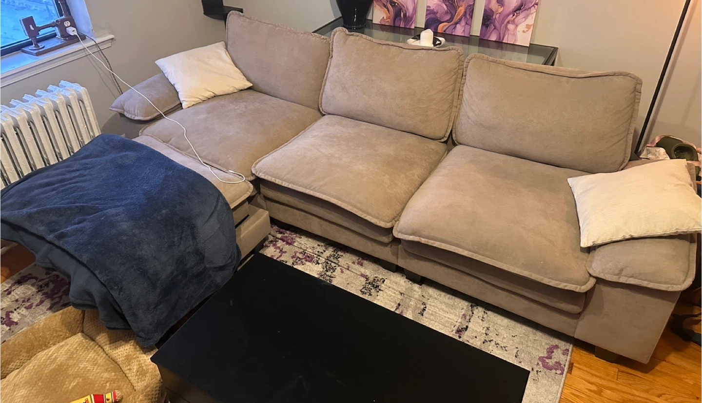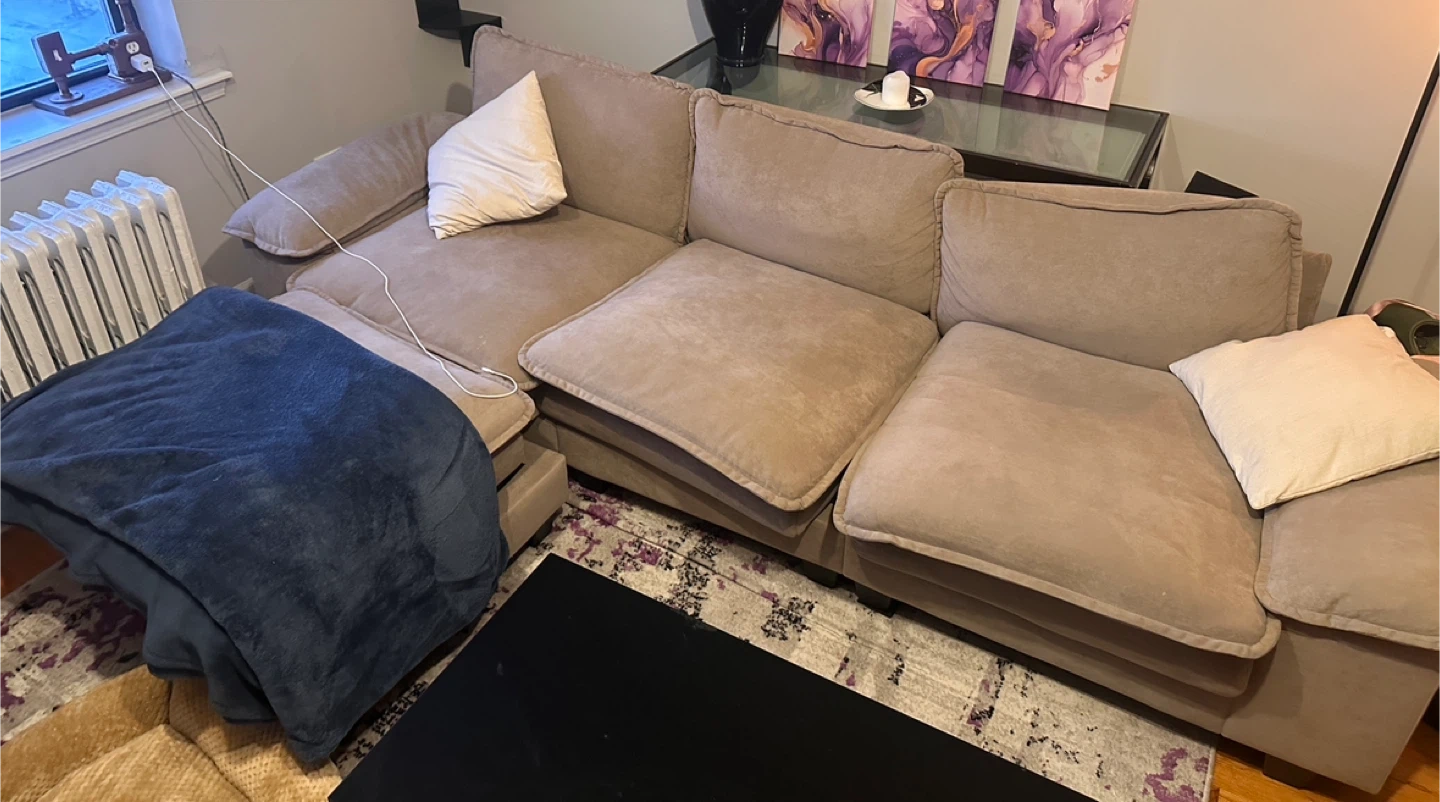 This is a comfortable beige sectional sofa. It's upholstered in a microfiber soft fabric. Very comfortable only a year old lightly used. Removable covers for easy washing.