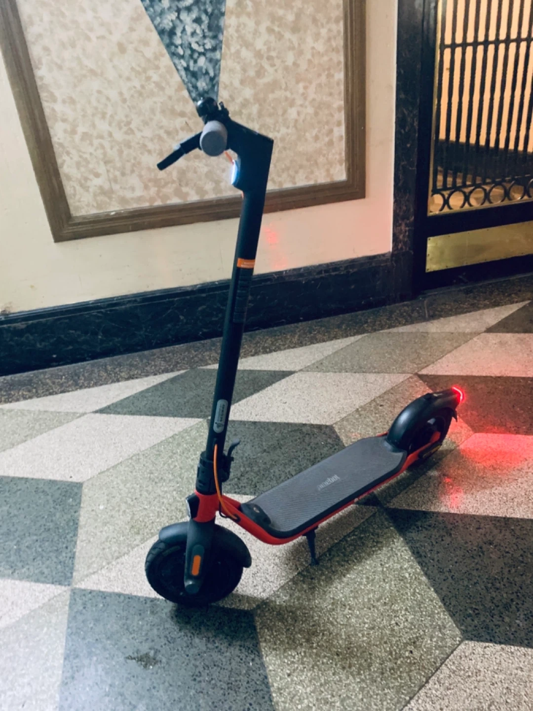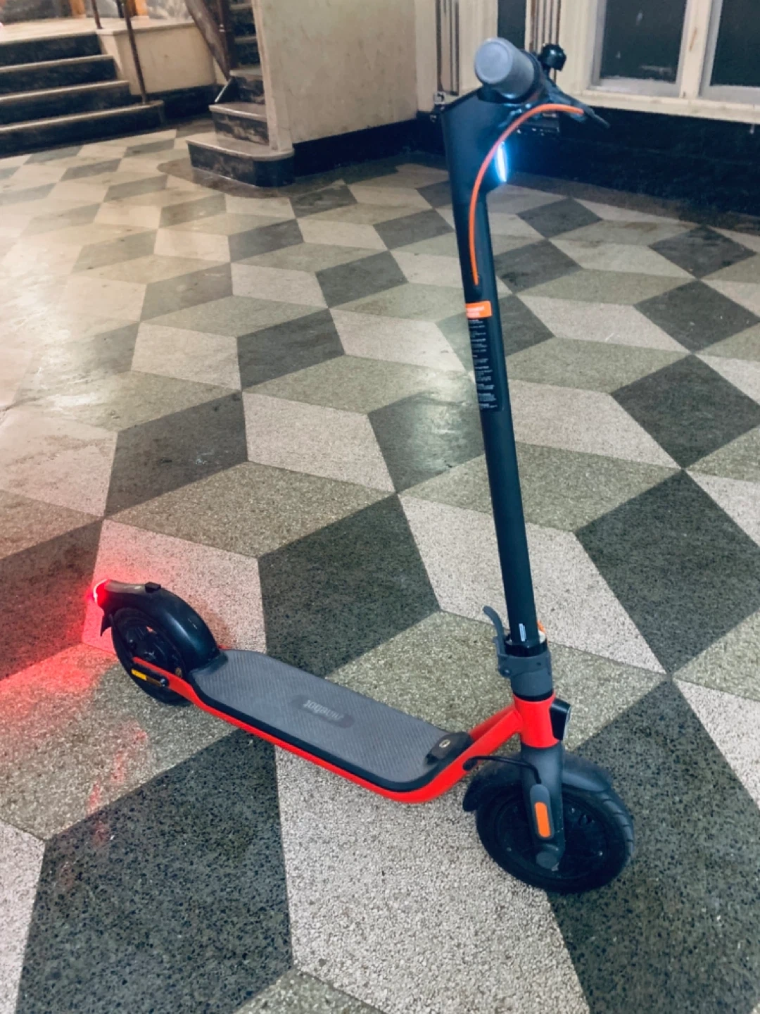 This is a Ninebot electric scooter. It's red and black run fast 20MPH foldable scooter easy to carry bus train big scooter for adults 10 inches wells high quality scooter waterproof best scooter original price 500$ dollars this scooter check online selling for 180$ only coz no scooter allowed my building come with original charger come with app download app you phone best scooter for make uber eats full