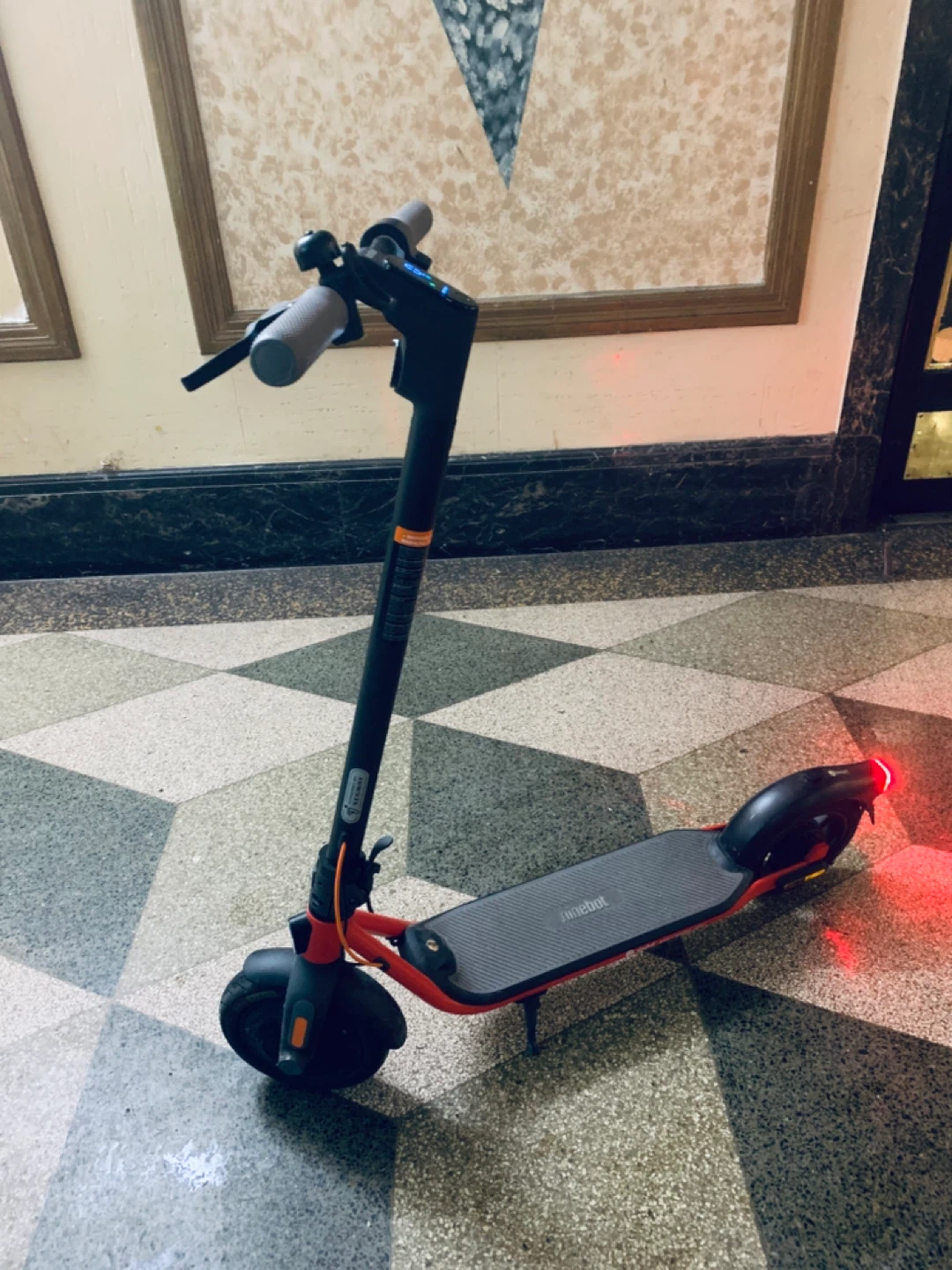 This is a Ninebot electric scooter. It's red and black run fast 20MPH foldable scooter easy to carry bus train big scooter for adults 10 inches wells high quality scooter waterproof best scooter original price 500$ dollars this scooter check online selling for 180$ only coz no scooter allowed my building come with original charger come with app download app you phone best scooter for make uber eats full