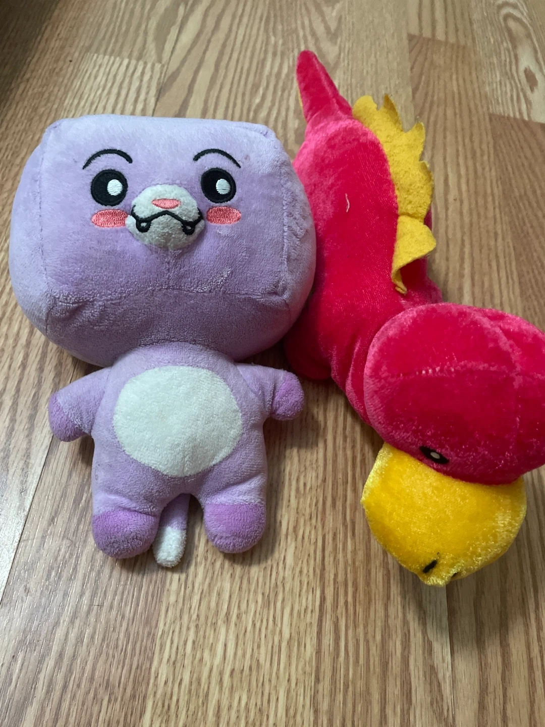 Selling these cute plush toys! They're in good condition and ready for a new home. The purple one has a unique square shape and adorable face.