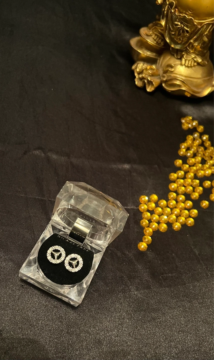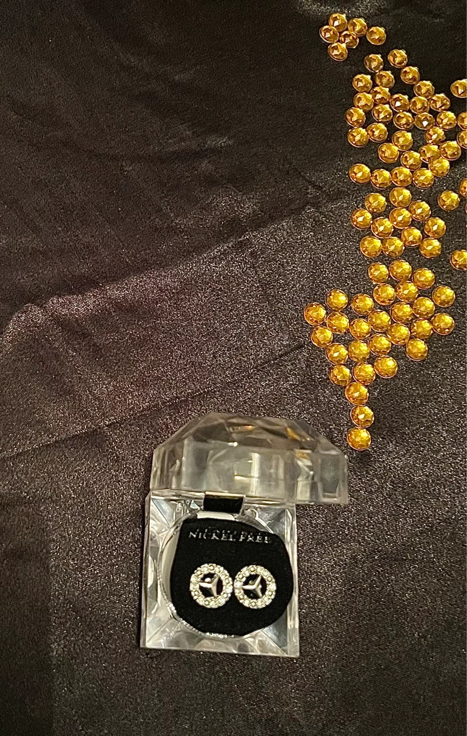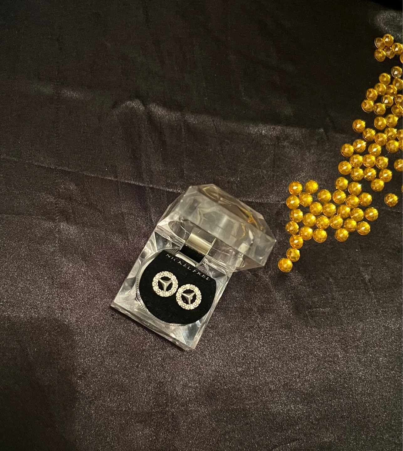 Sparkling crystal stud earrings shaped like peace signs. These studs are presented in a clear, hinged display case. They have never been worn but some minor scratching on the case is present. The velvet inside box is bent here and there. They're designed to add a touch of glamour to any outfit. Perfect for everyday wear or special occasions!