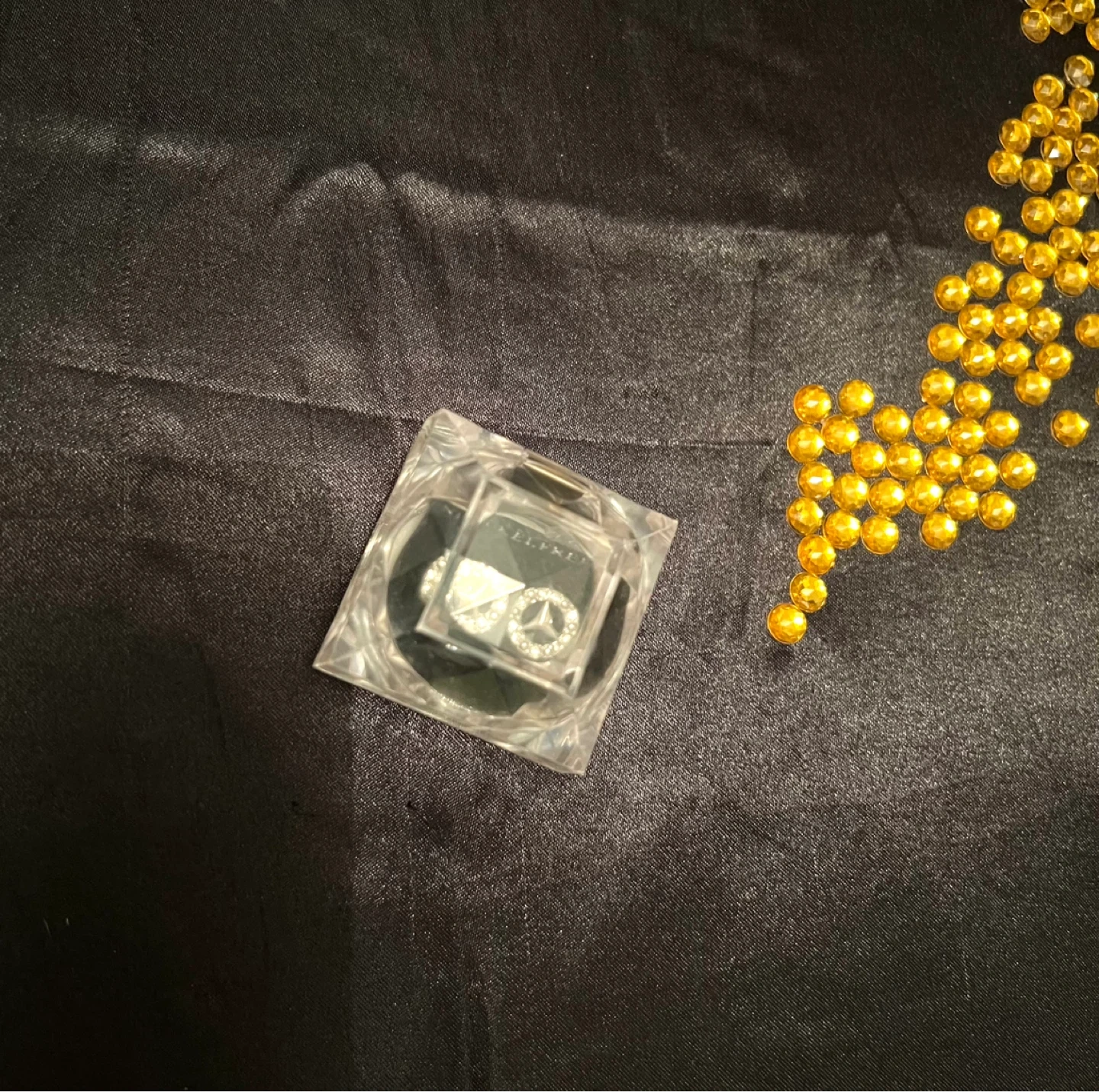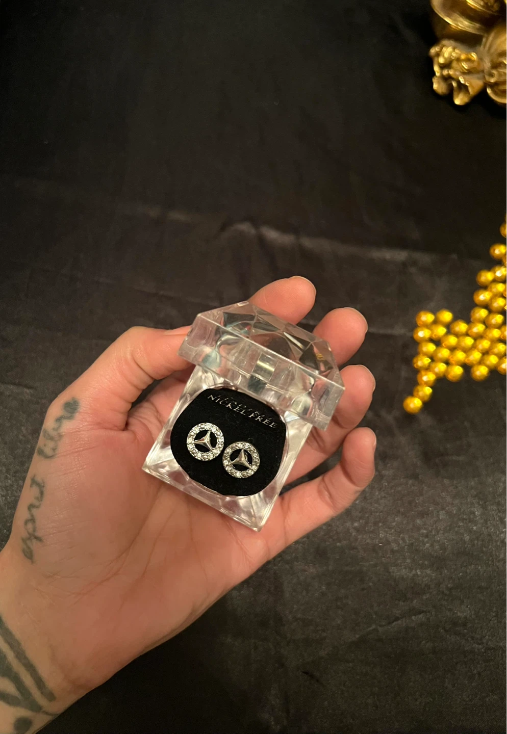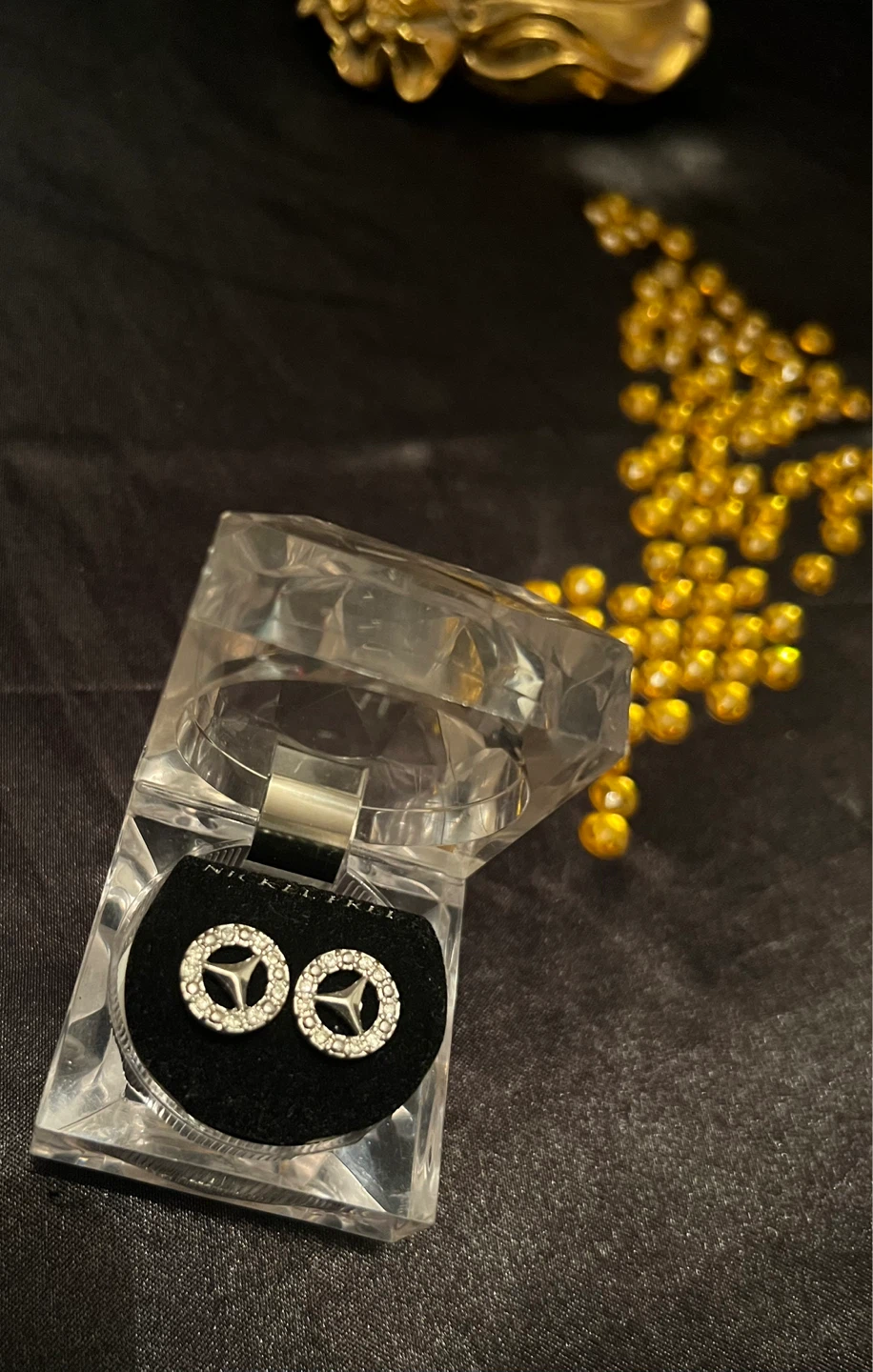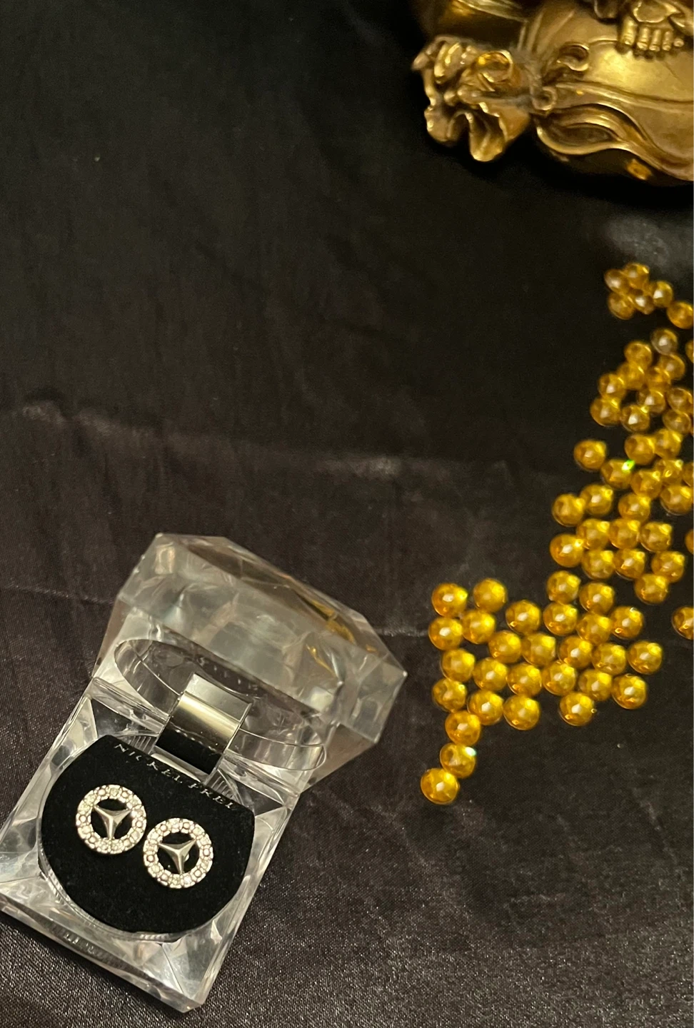 Sparkling crystal stud earrings shaped like peace signs. These studs are presented in a clear, hinged display case. They have never been worn but some minor scratching on the case is present. The velvet inside box is bent here and there. They're designed to add a touch of glamour to any outfit. Perfect for everyday wear or special occasions!