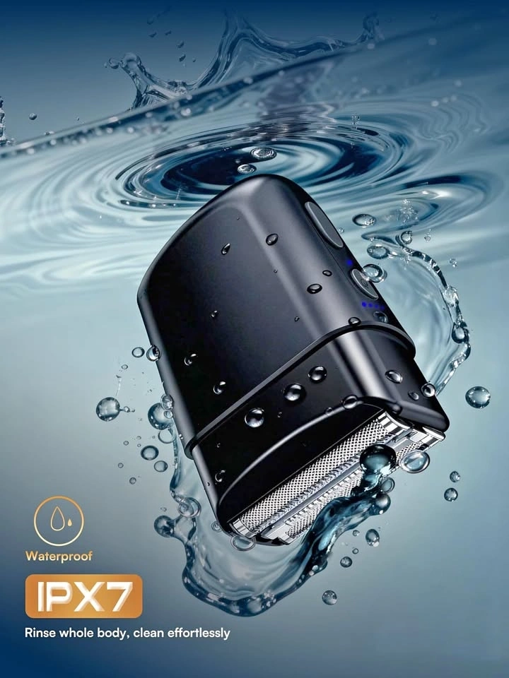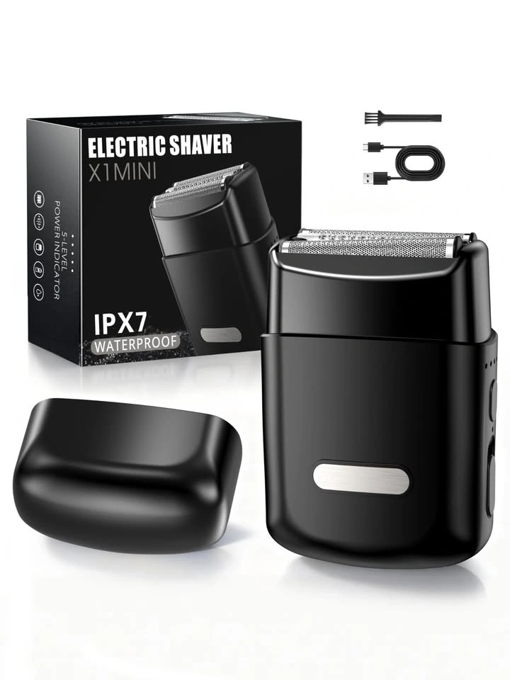 New X1MINI electric shaver. This shaver is super waterproof (IPX7!), so you can rinse the whole thing easy. It has a magnetic dual-head for quick cleaning. Comes with a USB-C charging cable, cleaning brush, user manual, and a handy pouch.
