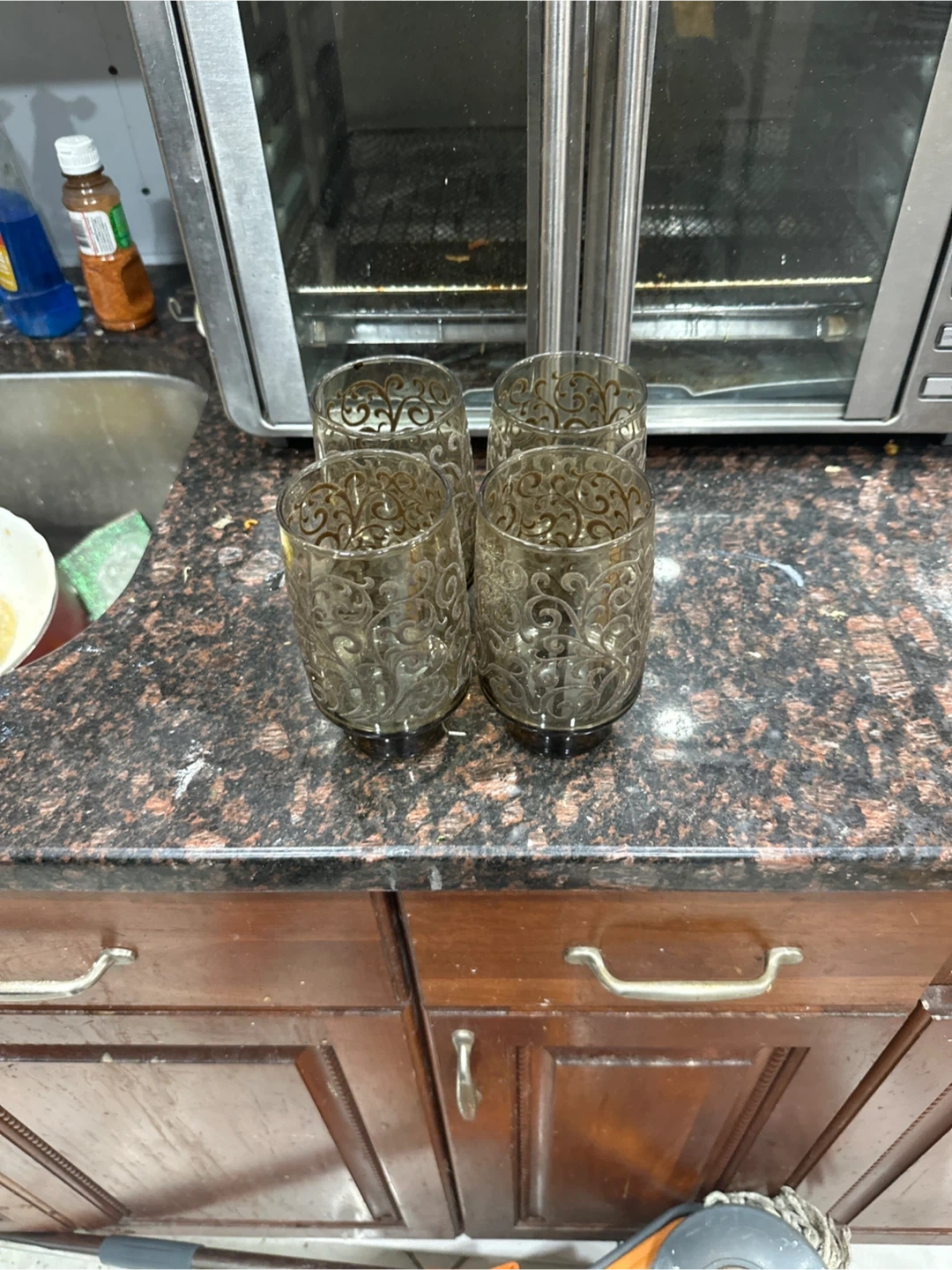 Selling a set of four decorative glasses! They have a beautiful, intricate pattern on them that catches the light nicely. They're perfect for adding a touch of elegance to your table setting or for everyday use