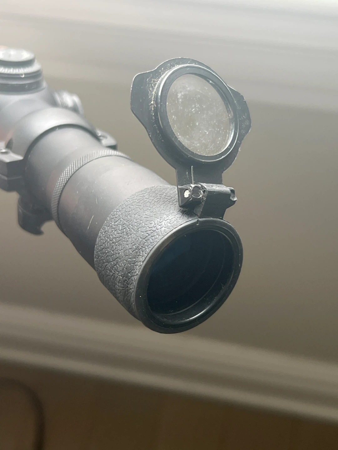 flip-up lens caps. Some wear and tear see fotos. Missing one of the 30mm rings a screw” But still in working condition.