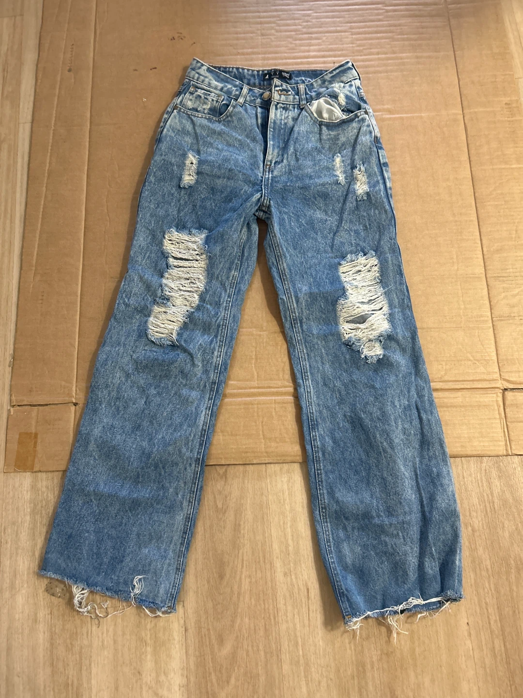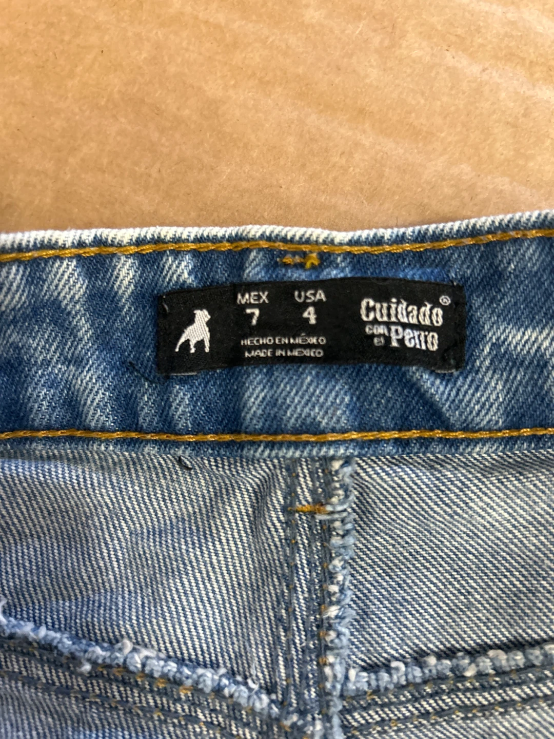 Selling a pair of Cuidado con el Perro distressed jeans in a women's size 4. They have a light blue wash with lots of ripped details. These jeans are made in Mexico.
