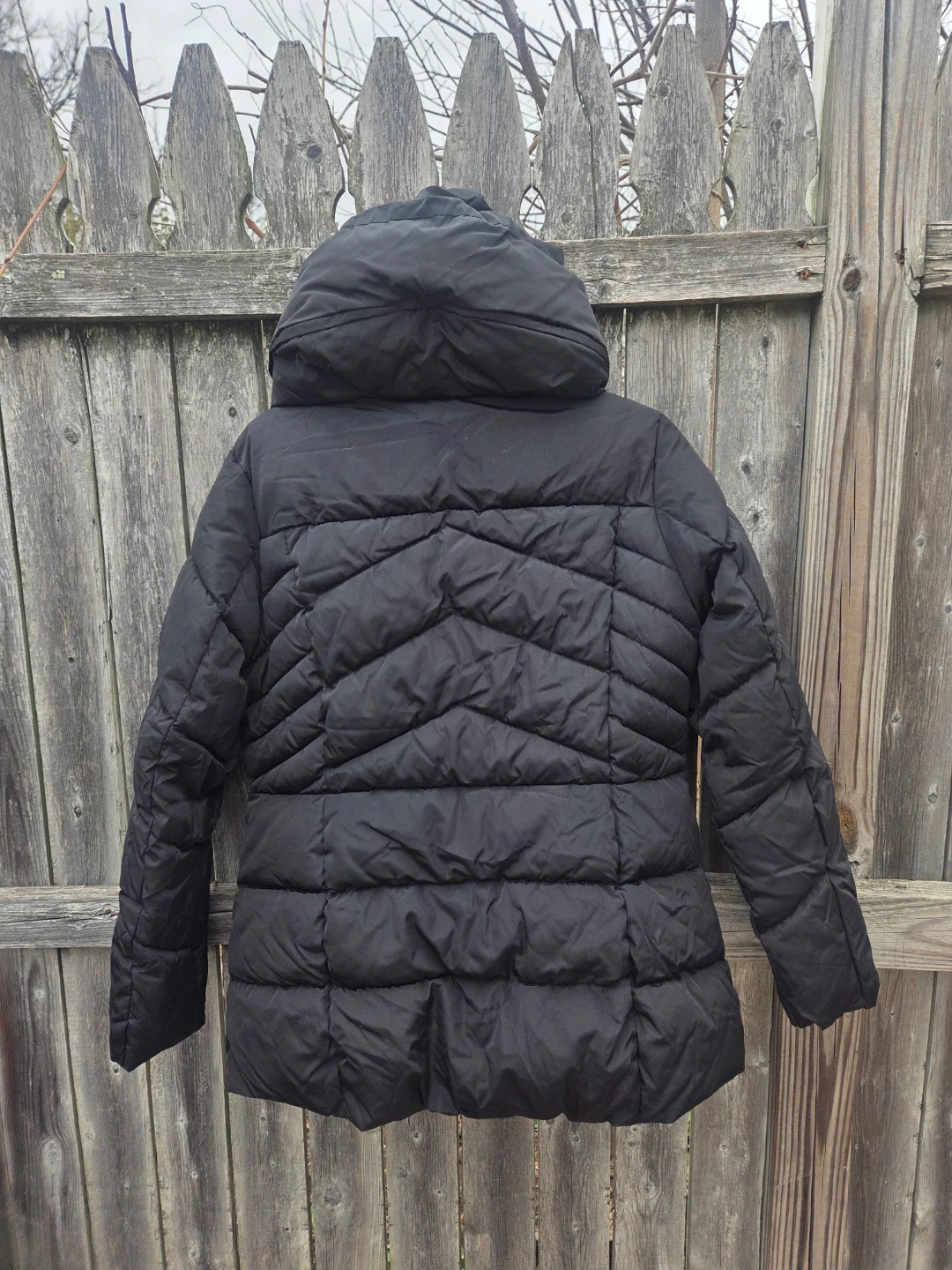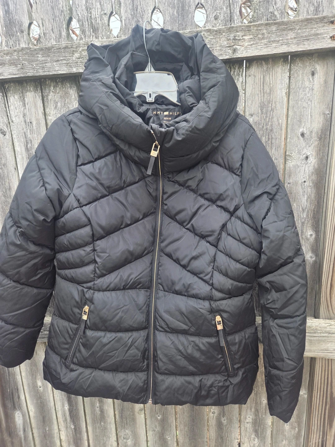 Tommy Hilfiger black puffer jacket with a high collar and hood. Made with 100% recycled polyester fabric and padding. It's water resistant and machine washable! A warm coat for cooler weather.