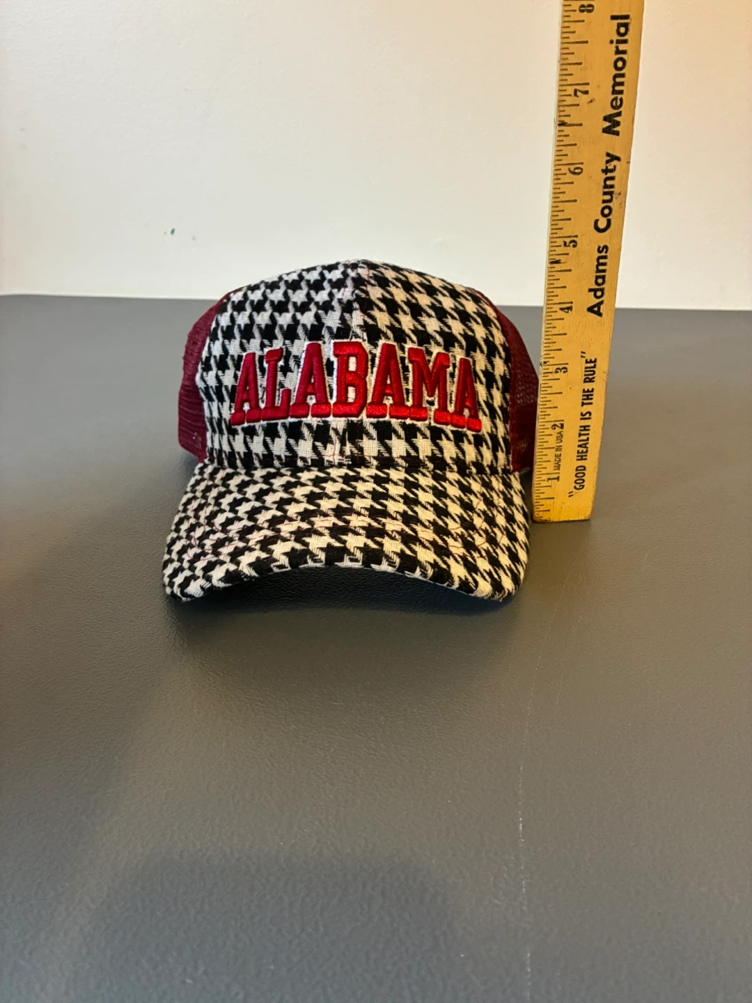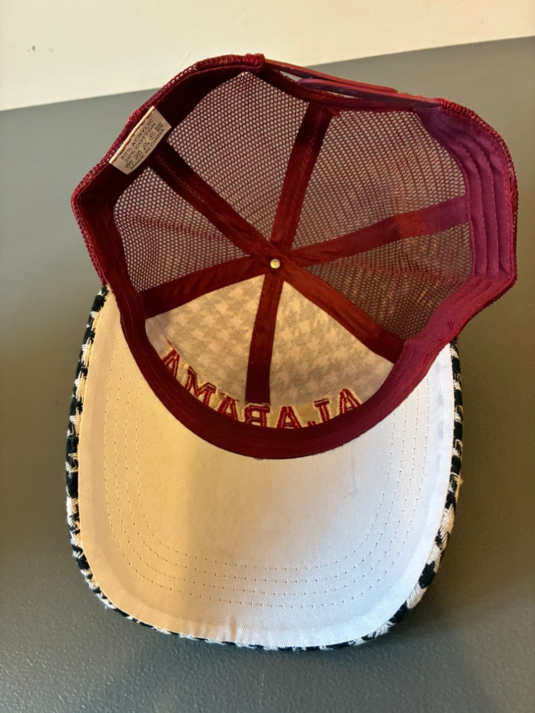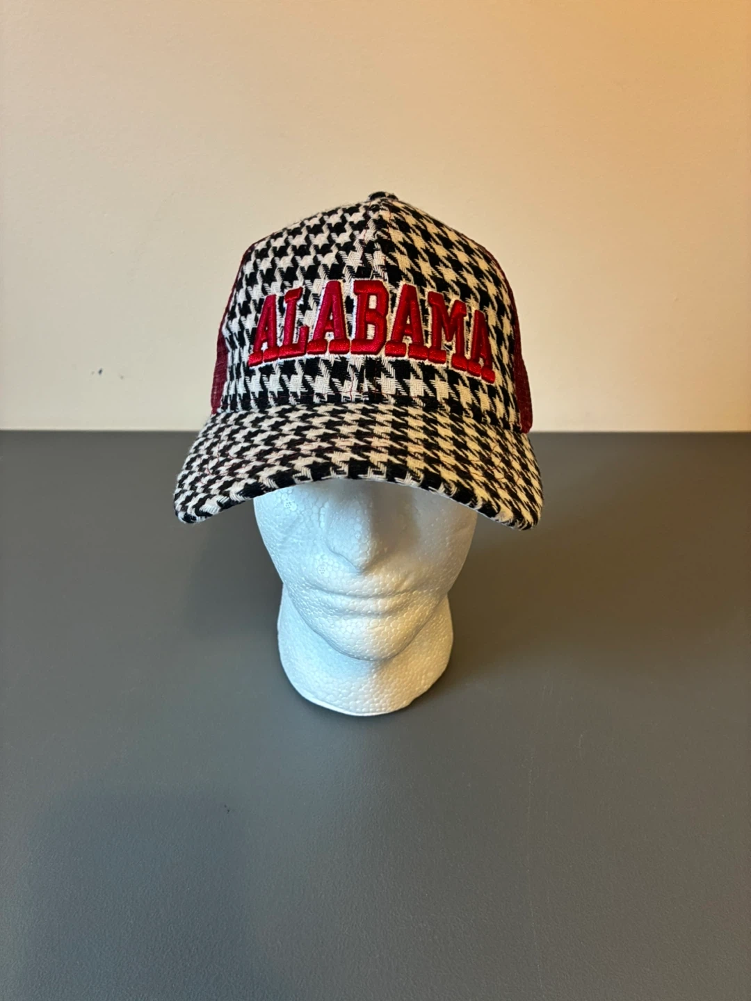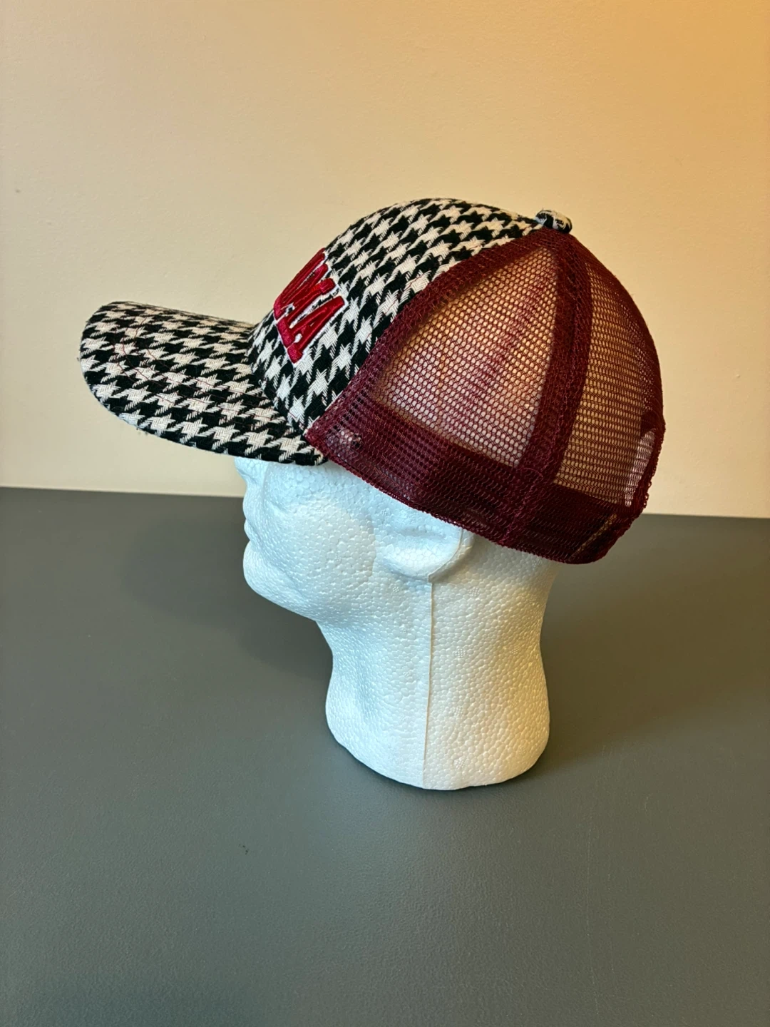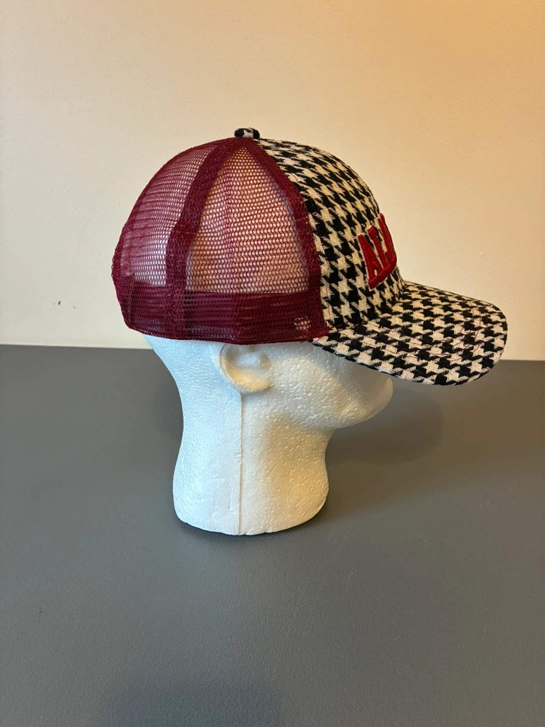 Houndstooth trucker hat with 'ALABAMA' embroidered on the front in red. Features a maroon mesh back and adjustable strap. One size fits most.