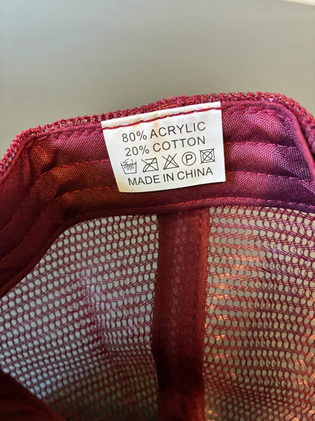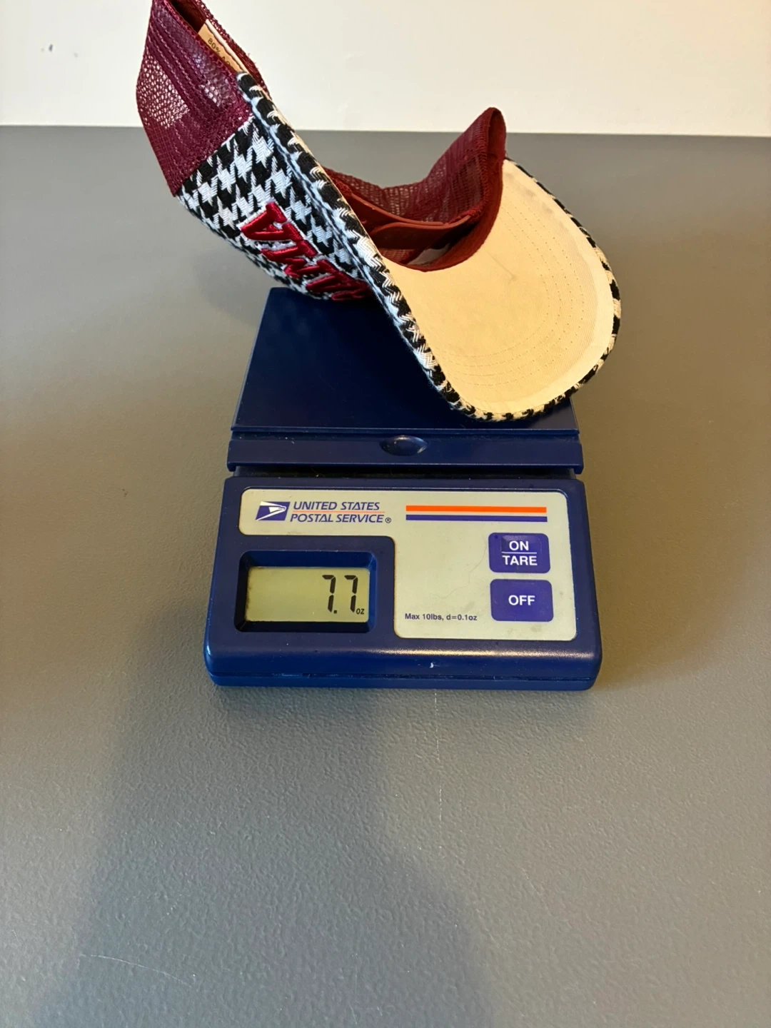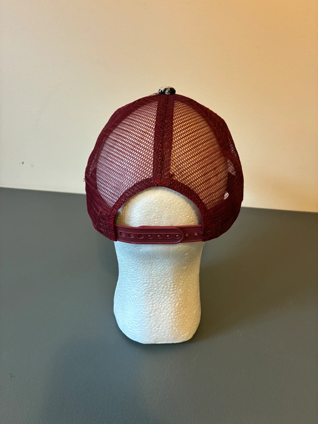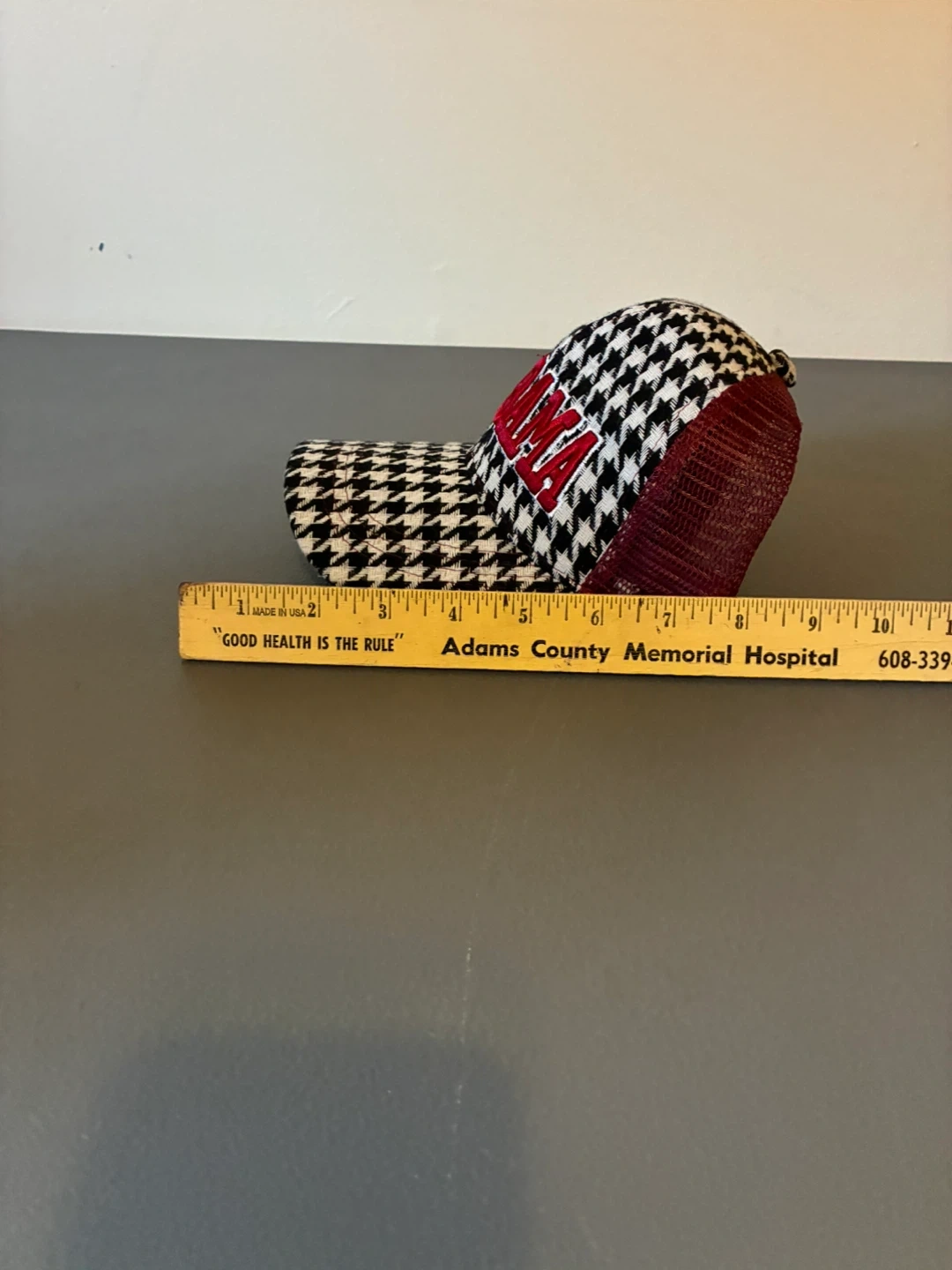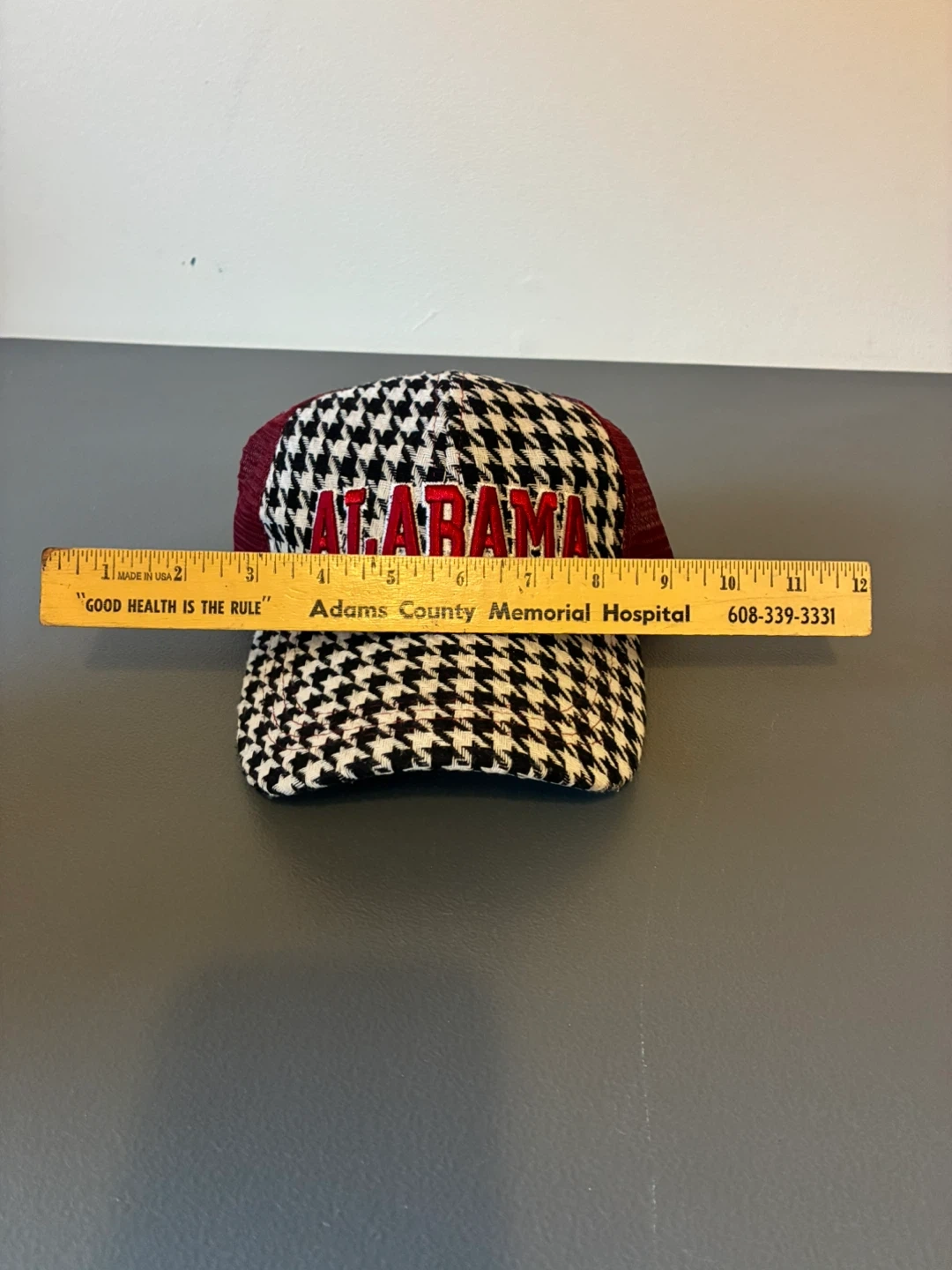Houndstooth trucker hat with 'ALABAMA' embroidered on the front in red. Features a maroon mesh back and adjustable strap. One size fits most.