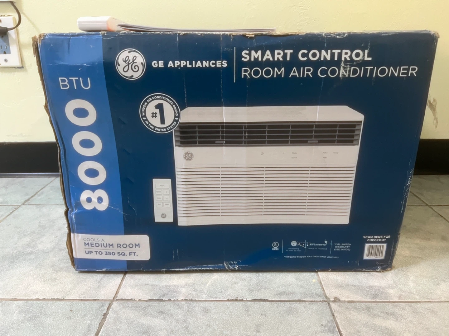 73Selling a GE 8000 BTU Smart Control Room Air Conditioner. It's in like-new condition and comes in the original box. Perfect for cooling a medium-sized room up to 350 sq ft. Includes the remote control and owner's manual/installation guide. Includes, window base as well. Selling bc I’m not gonna need it longer next year. I used it less than one month. Has dust in the exterior.