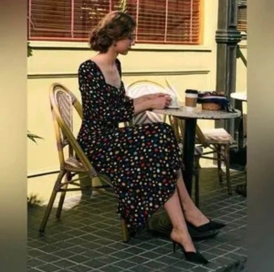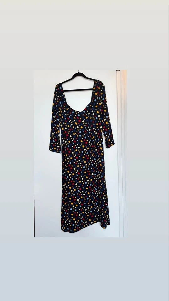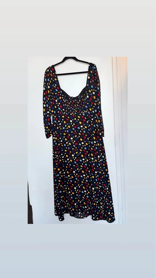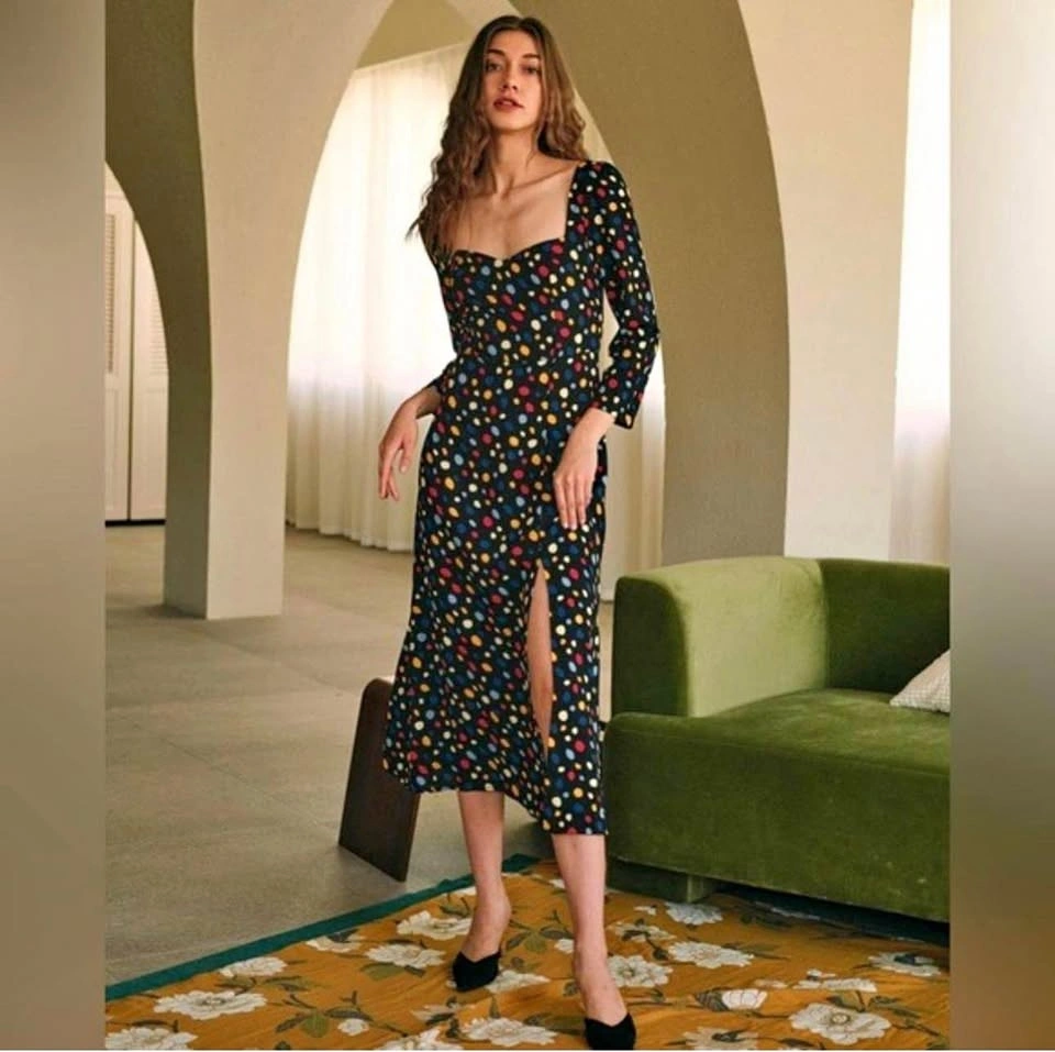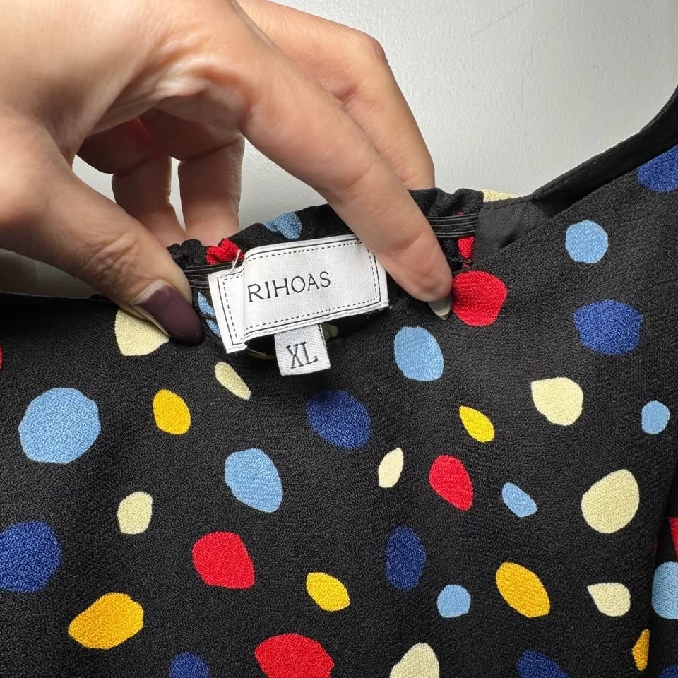 The brand is Rihoas, featuring a print similar to a Reformation dress.