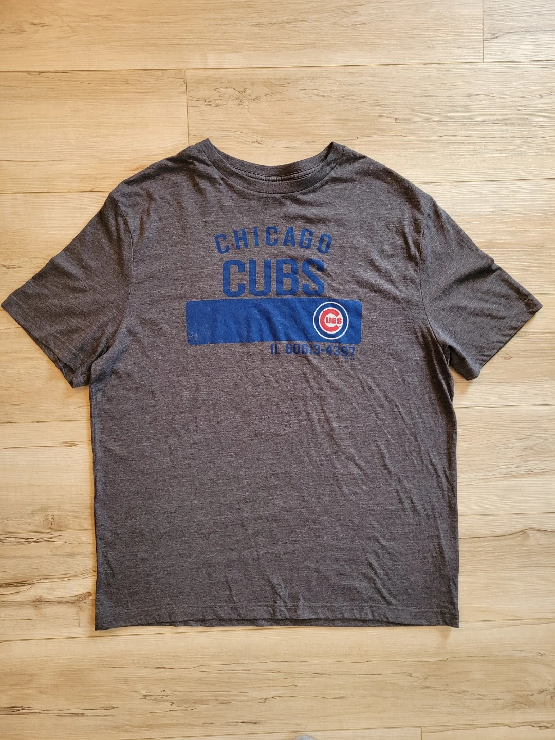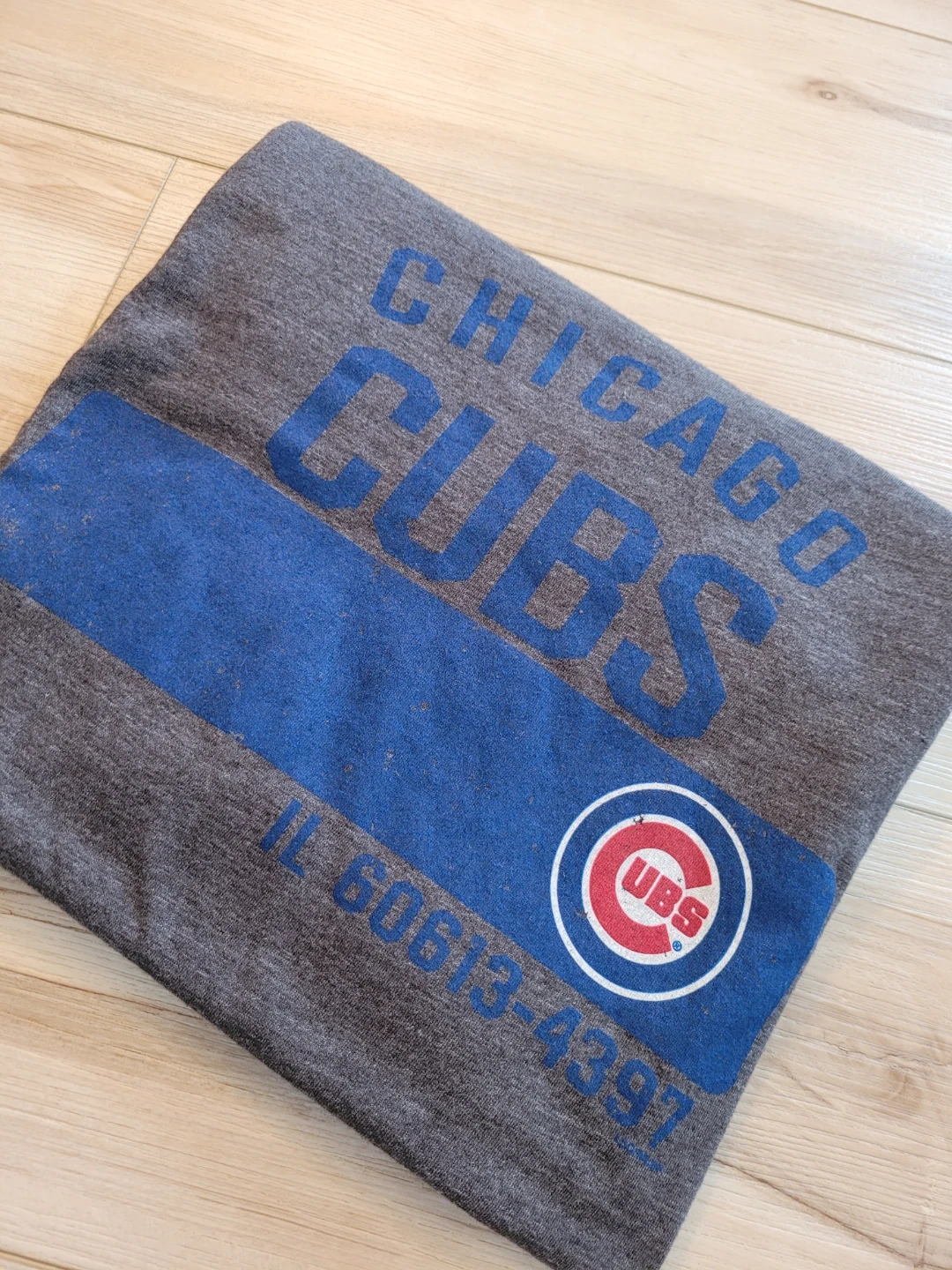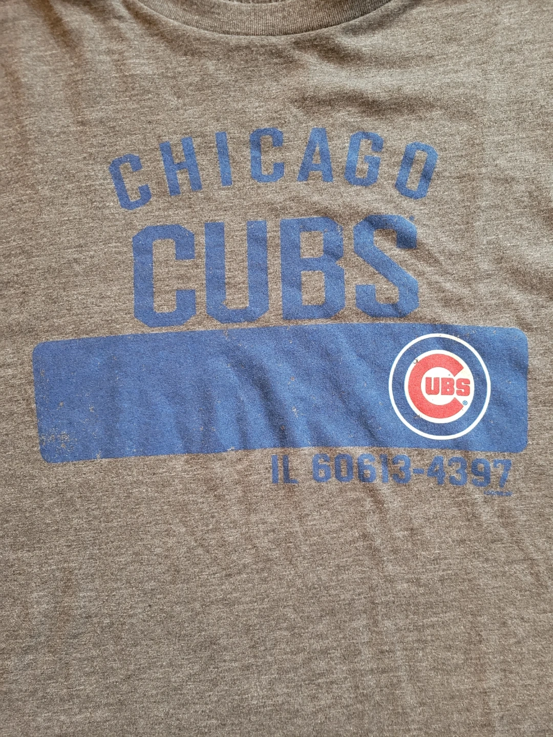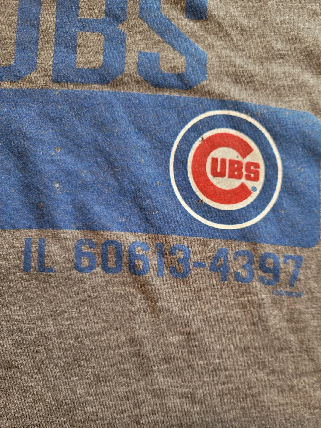 Gray Chicago Cubs t-shirt with official MLB logo with stylish worn look and zip code.