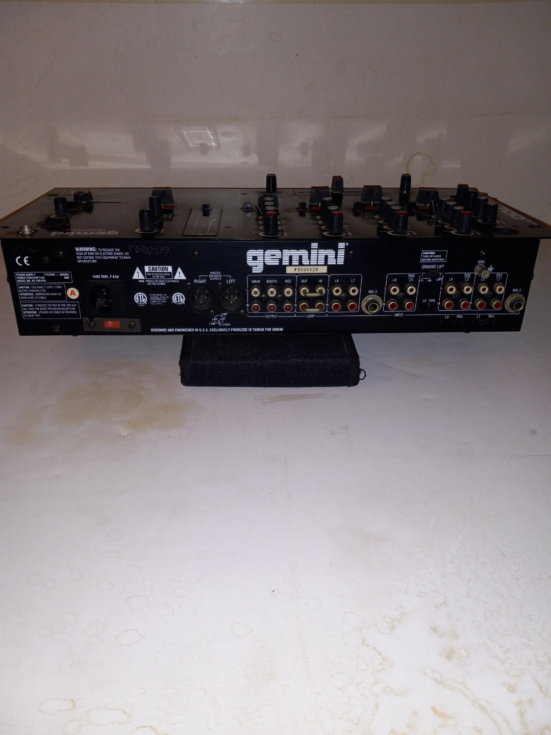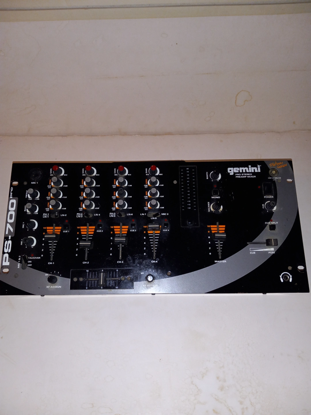 60Gemini PS-700 4-channel professional DJ mixer. Used condition. Features include multiple inputs and outputs, EQ controls, and a master section. Great for DJs and audio enthusiasts.