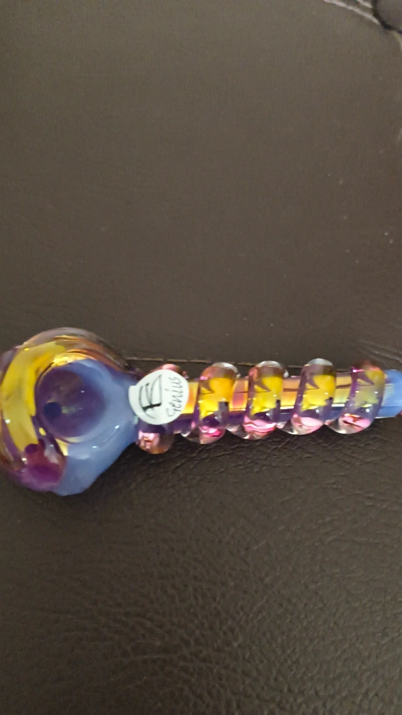 65Selling a glass pipe from Genius. It has a unique design with a spiral pattern and is made of colorful glass. The original price was $29.99 but selling for $15