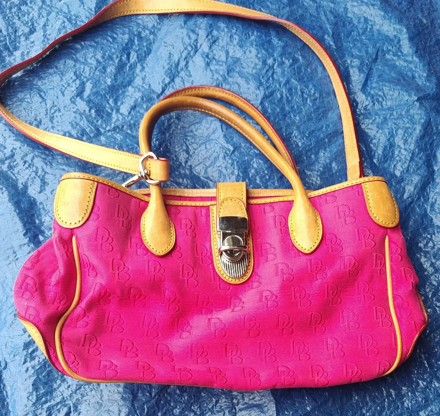A Dooney & Bourke satchel with a pink monogram pattern. It has tan leather trim and handles. Includes an adjustable strap for shoulder or crossbody wear. Snap closure.