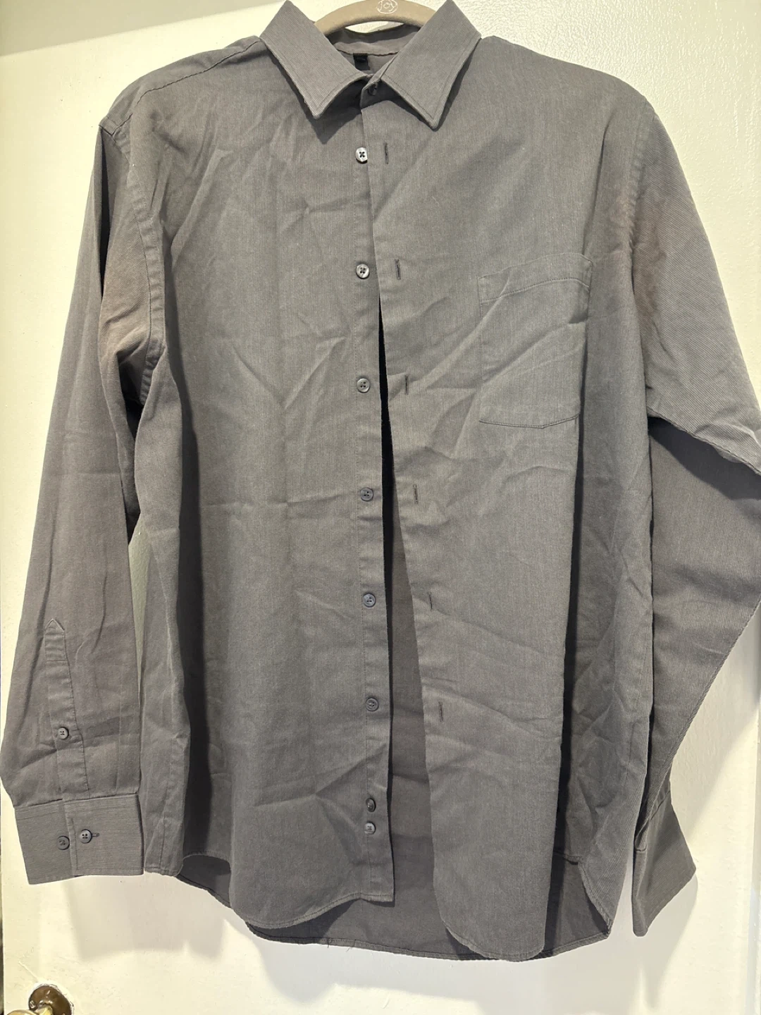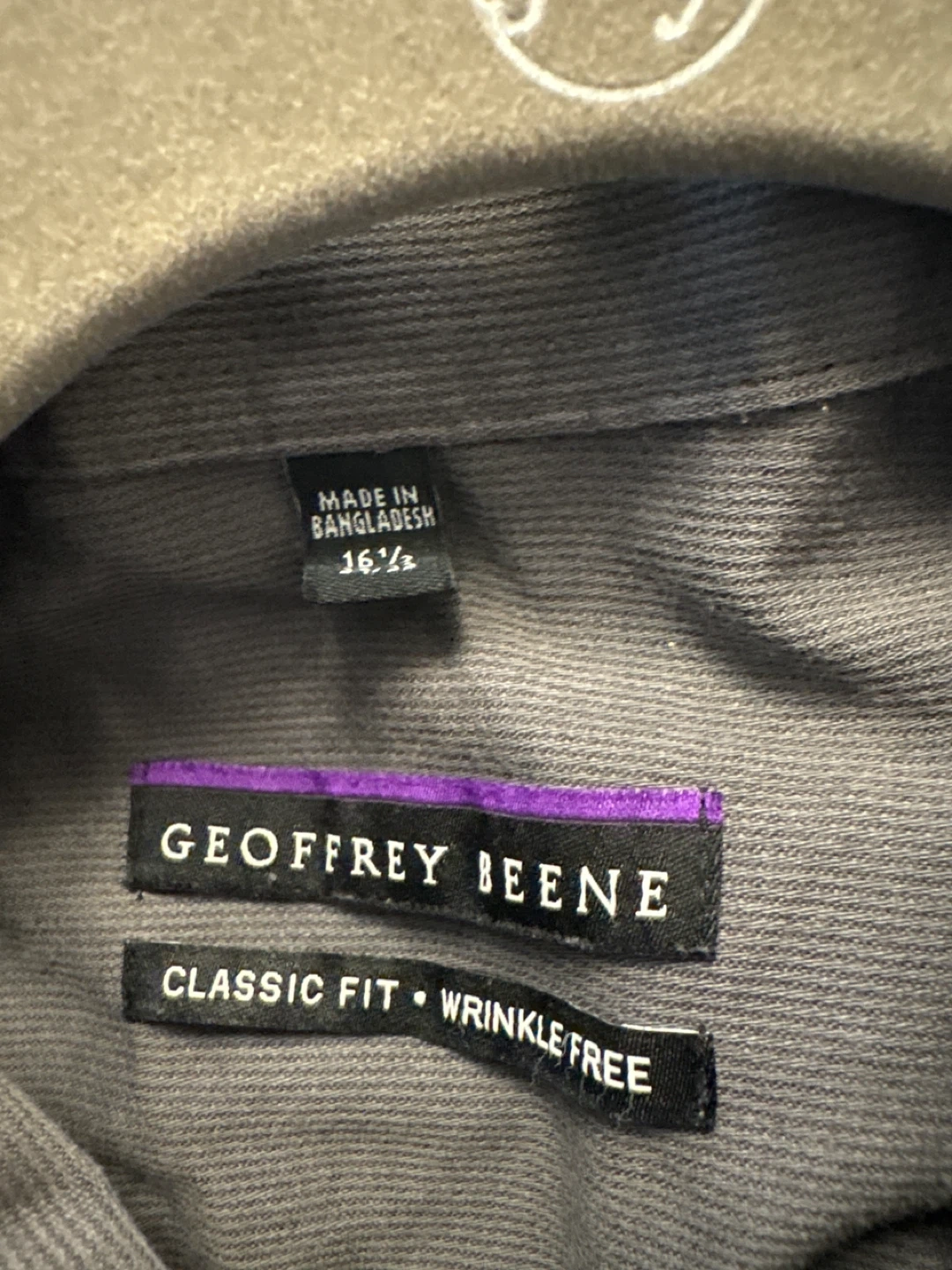 Selling a gray fine pin stripe Geoffrey Beene shirt in size 16 1/2. It's a classic fit and wrinkle-free, so it's easy to care for. Made in Bangladesh