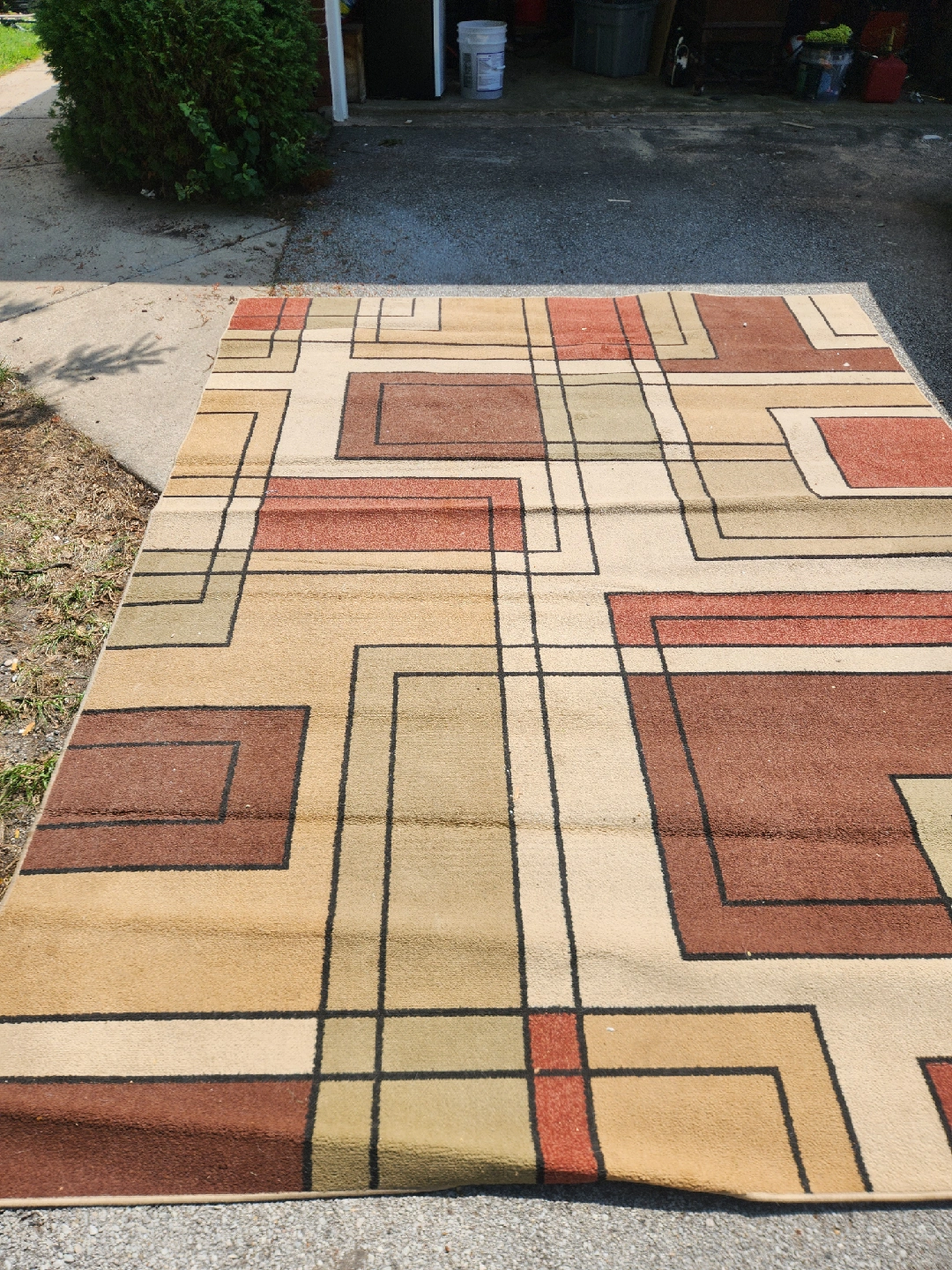 This is a stylish area rug with a geometric pattern in shades of brown, beige, and orange. It would look great in a living room or bedroom. The rug is in good condition and ready for a new home