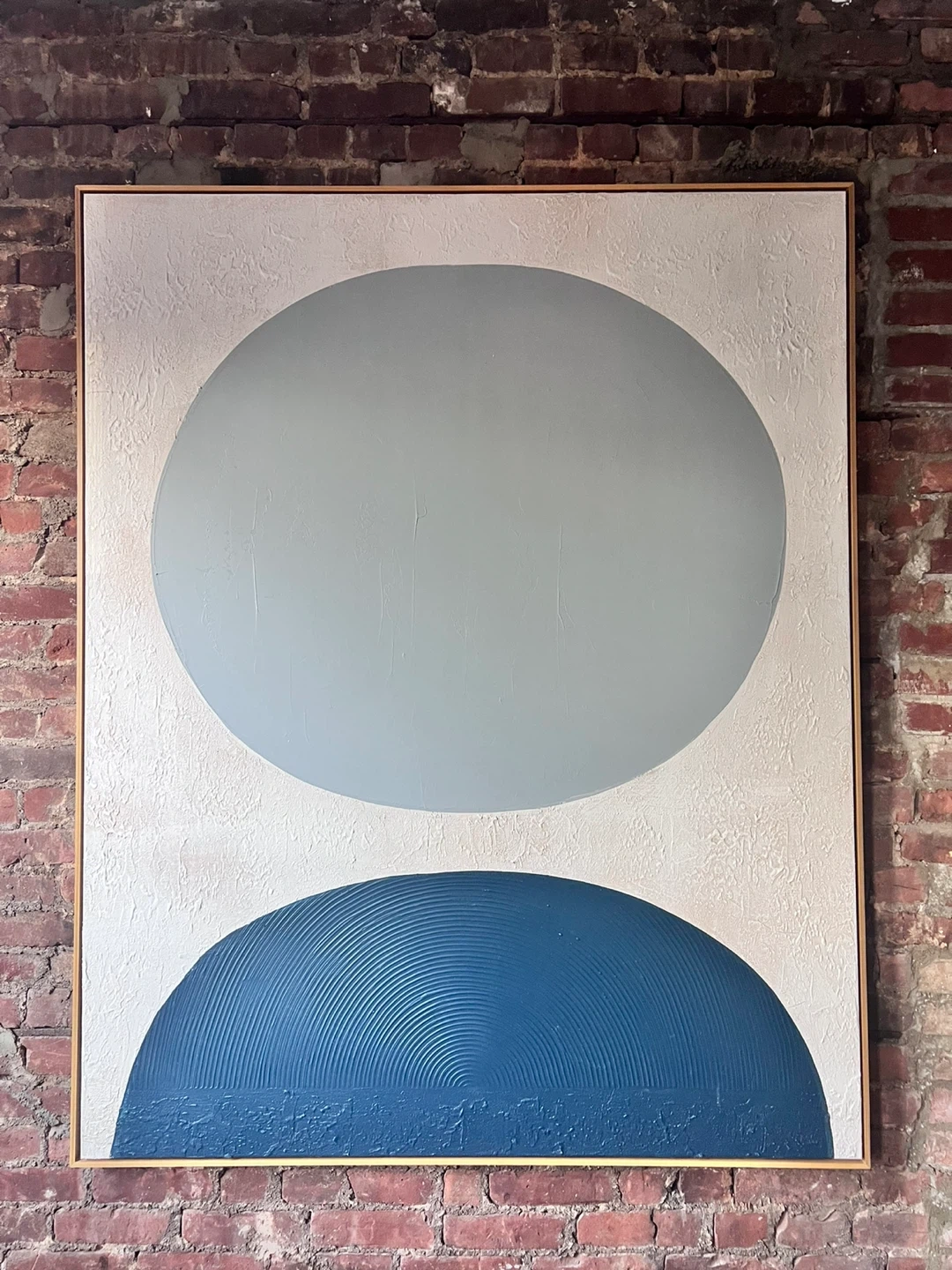 Striking large-scale artwork featuring geometric shapes in soft blue/gray and deep navy tones on a textured cream background. Framed in a slim natural wood frame for a polished finish. Dimensions: Approx. 5’ 4"H x 5’ 1"W