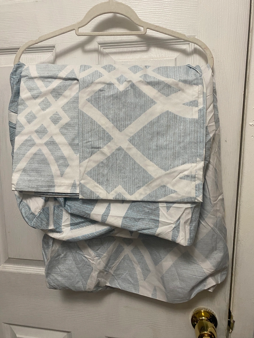 325A blue and white patterned bedding set with a geometric pattern with two pillowcases.