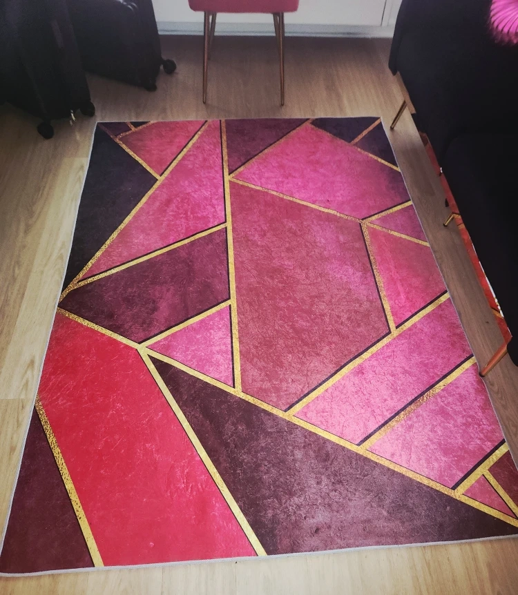 64Selling a rug with a geometric pattern in shades of pink, red, and brown with gold accents. It would look great in any room!