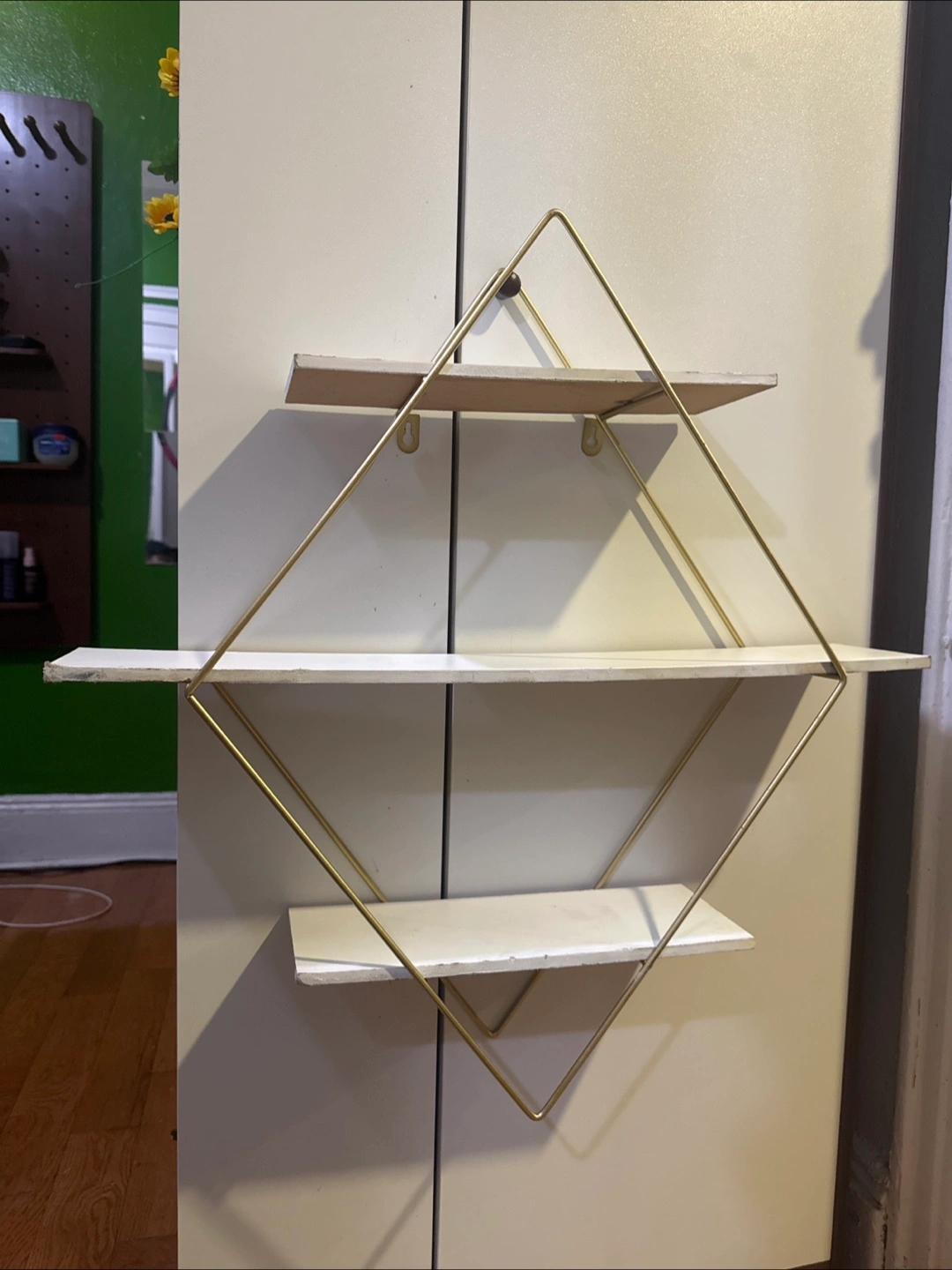 Selling a geometric wall shelf with a gold frame and white shelves. It's a stylish piece to add some flair to any room! Perfect for displaying small plants, books, or decorative items