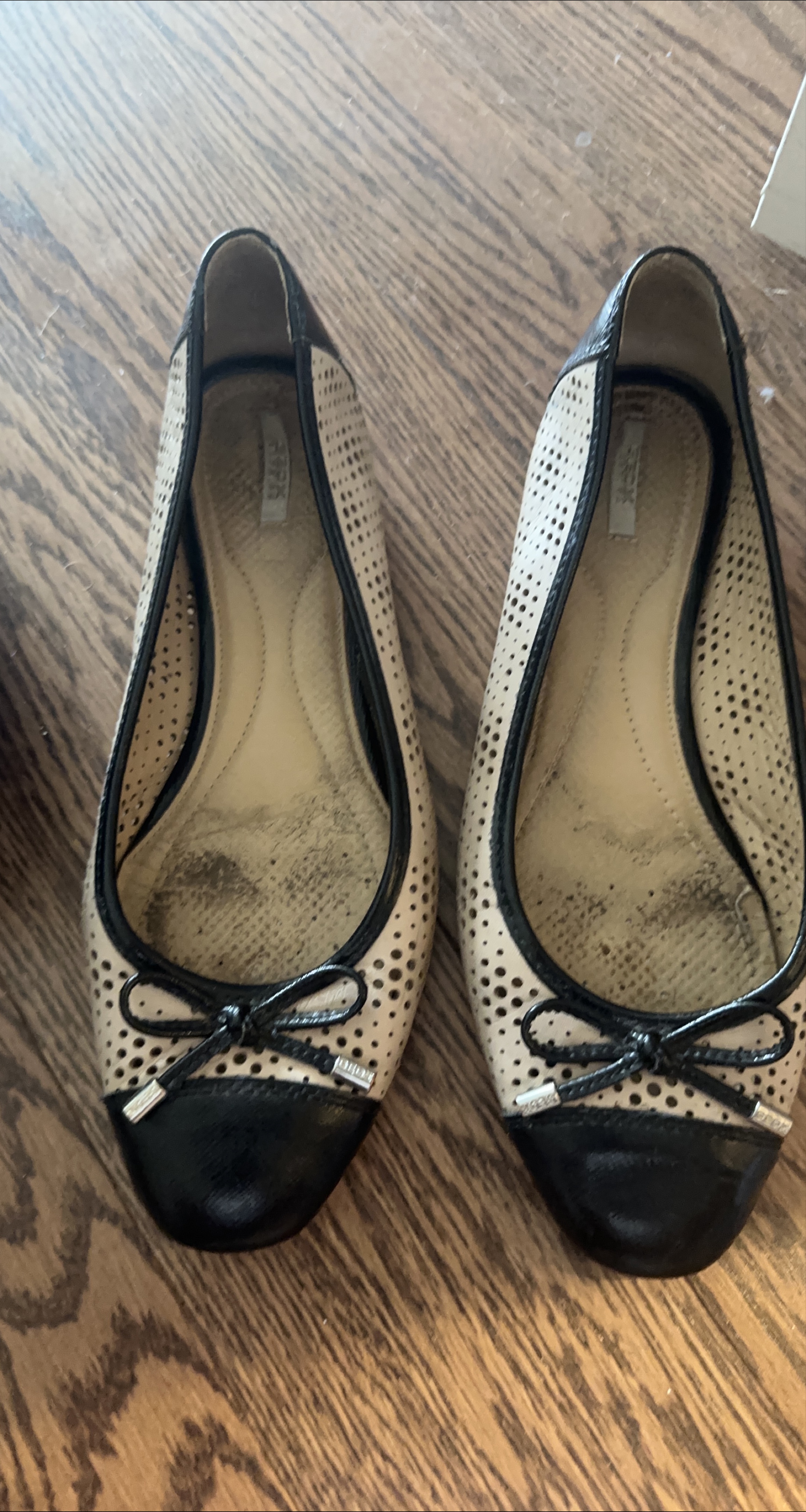 Selling a pair of Geox ballet flats in beige and black. They have a cute bow detail on the front. There are some signs of wear on the insole, but overall they're still in good condition