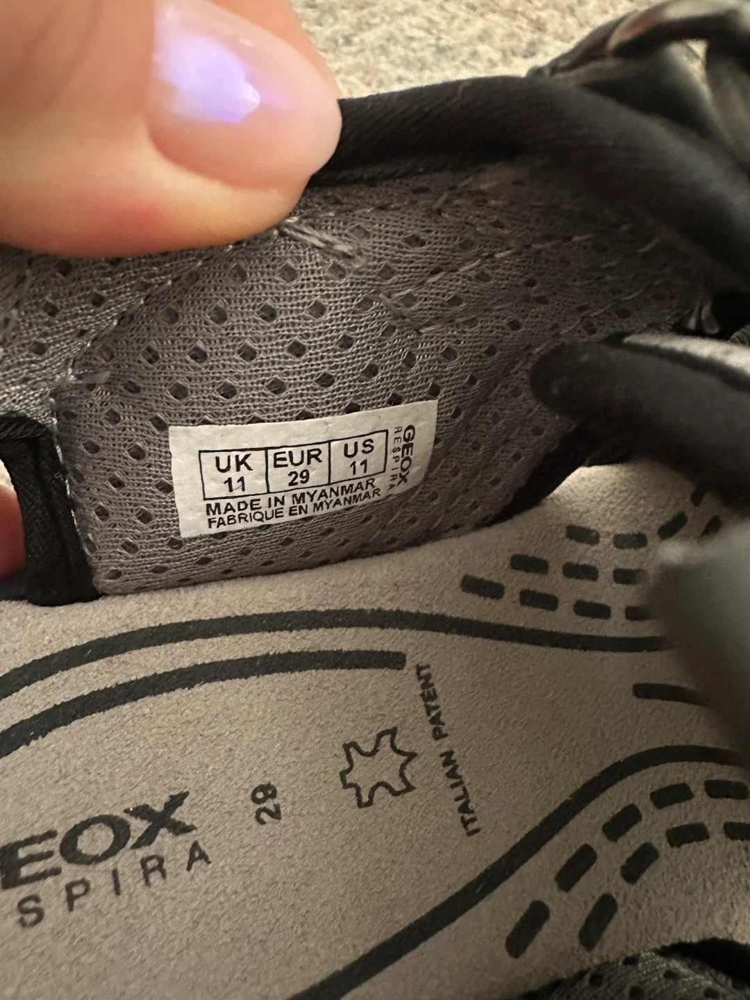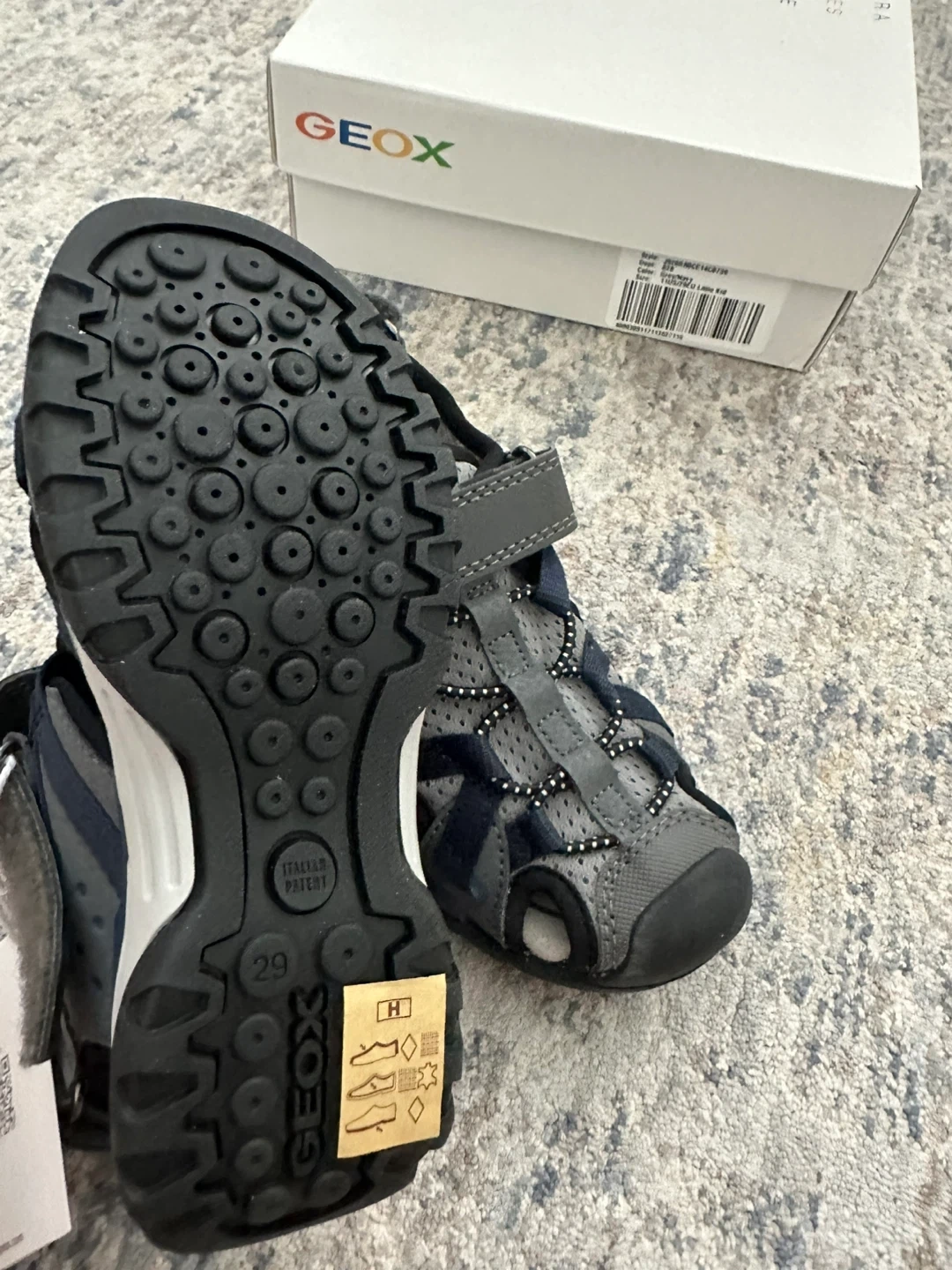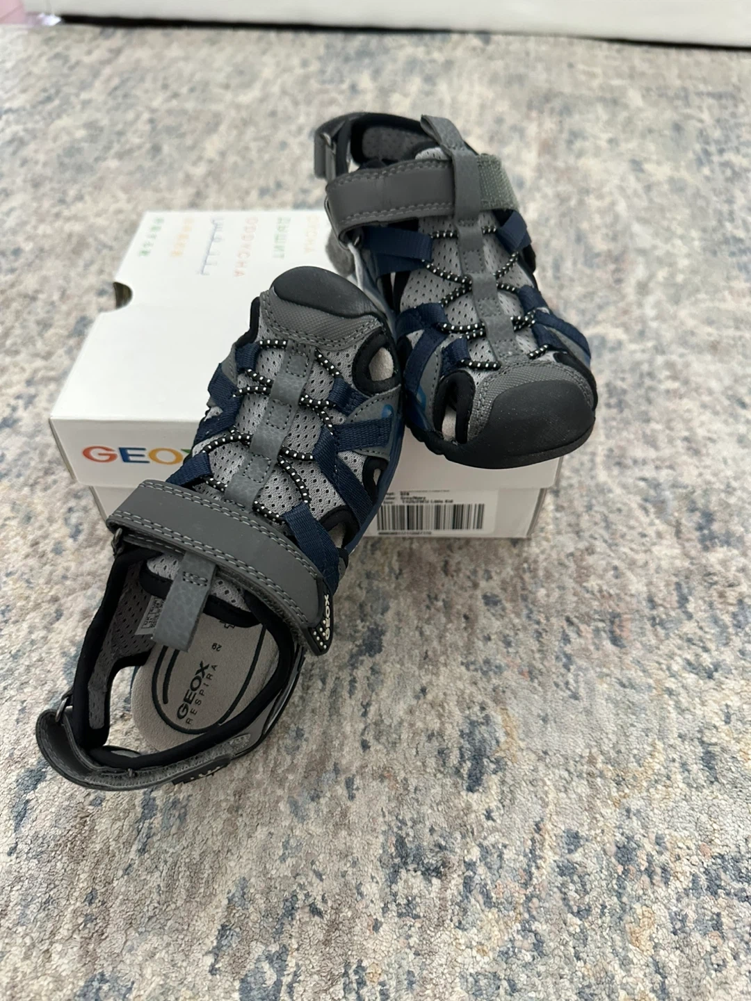 These Geox kids' sandals are brand new and ready for a new adventure! They feature a stylish strap design in shades of gray and navy. The size is US 11. Comes with the original box!