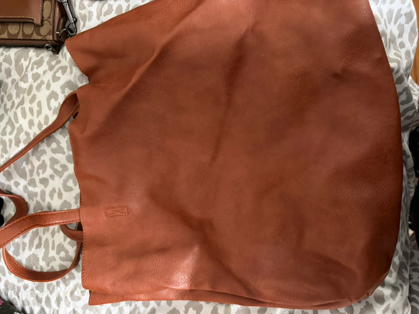 Here's a roomy brown leather tote bag! It's perfect for carrying all your essentials and more. The bag is in good condition and ready for a new owner.