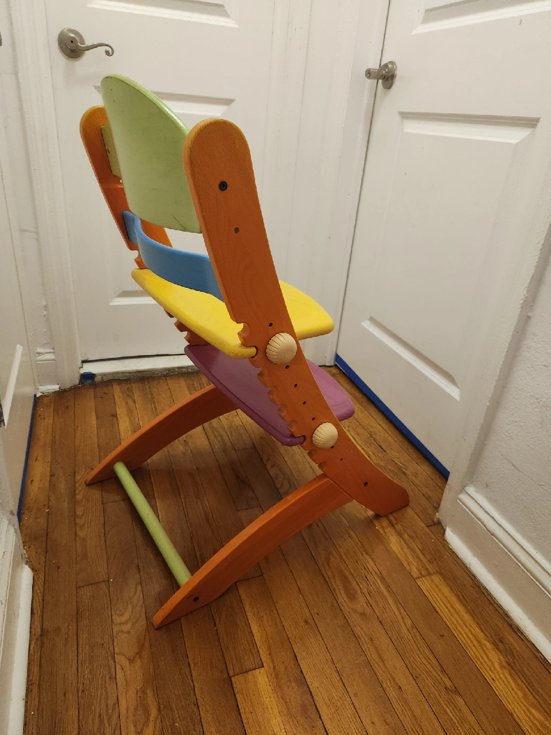 Selling a colorful high chair from Geuther! It's in good condition and ready for a new home. This chair is perfect for little ones learning to sit and eat at the table. The bright colors make it a fun addition to any room. Happy to disassemble!