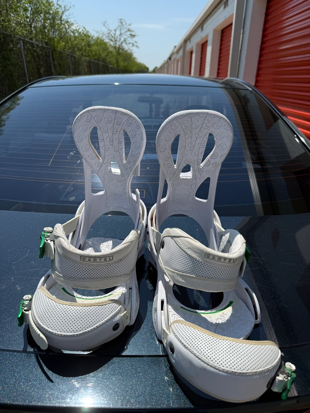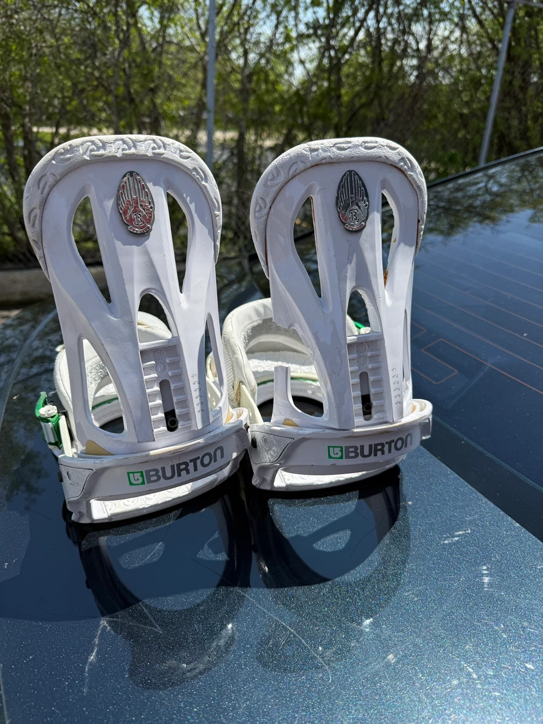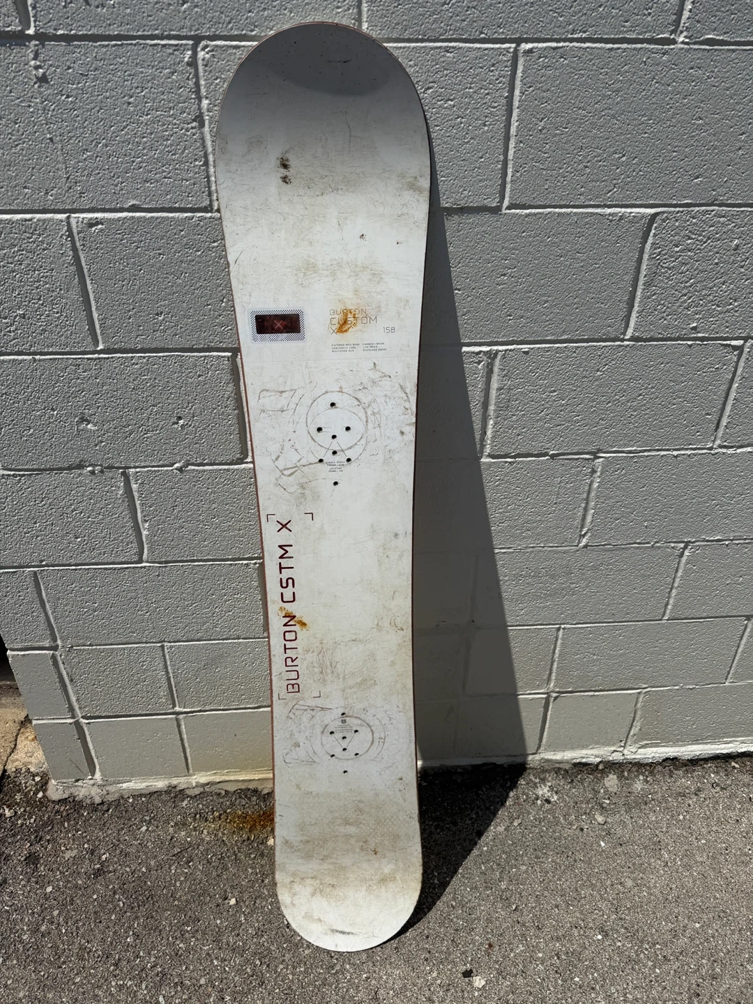 Selling a Burton Custom X 158 Snowboard paired with Cartel bindings. The board and bindings are white.