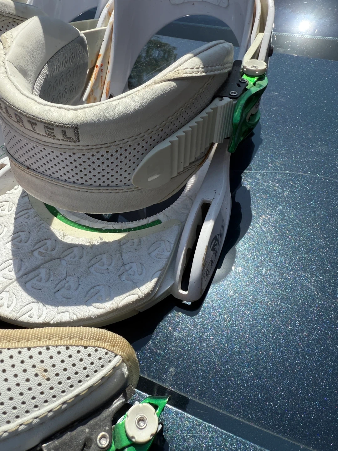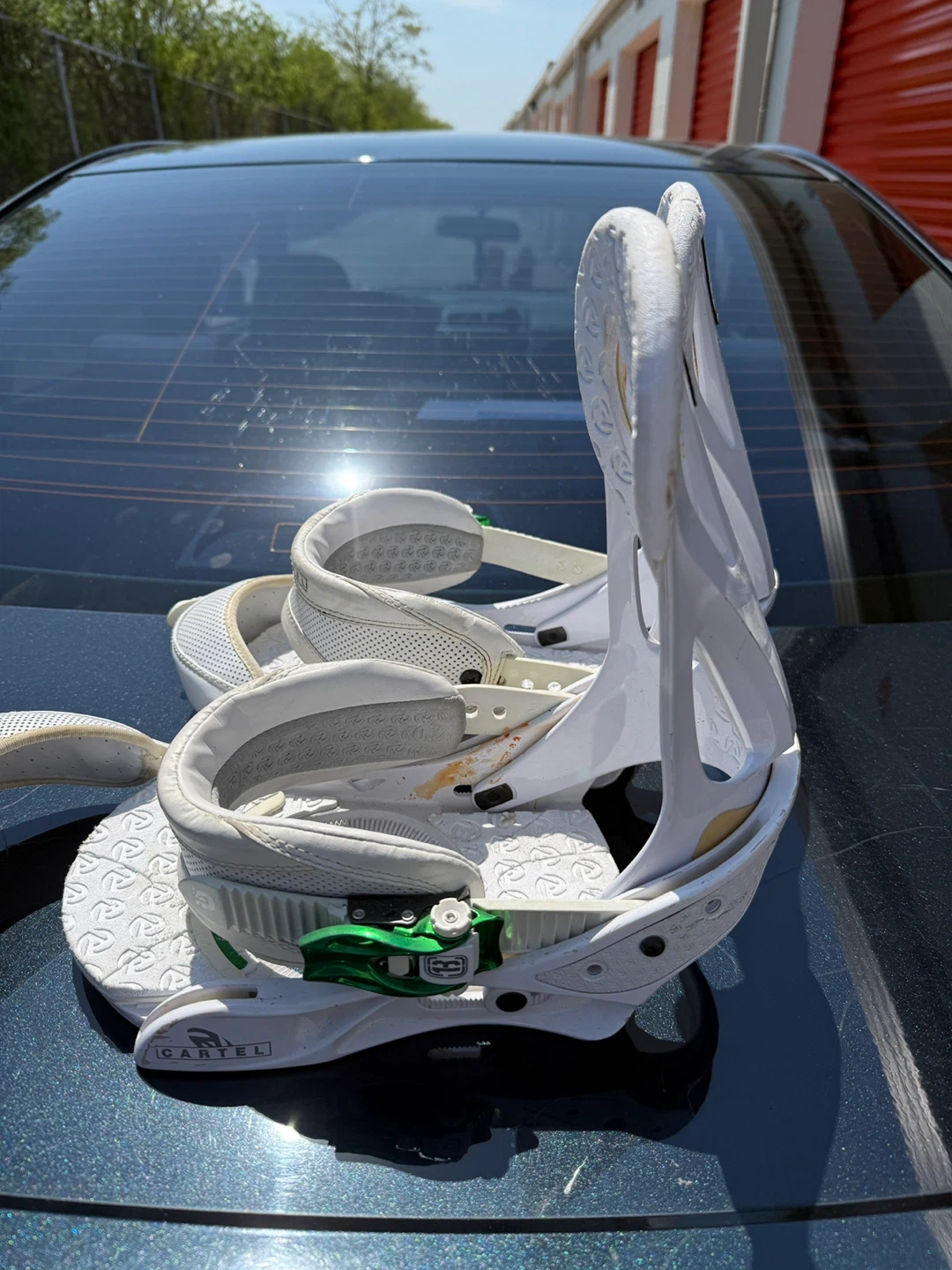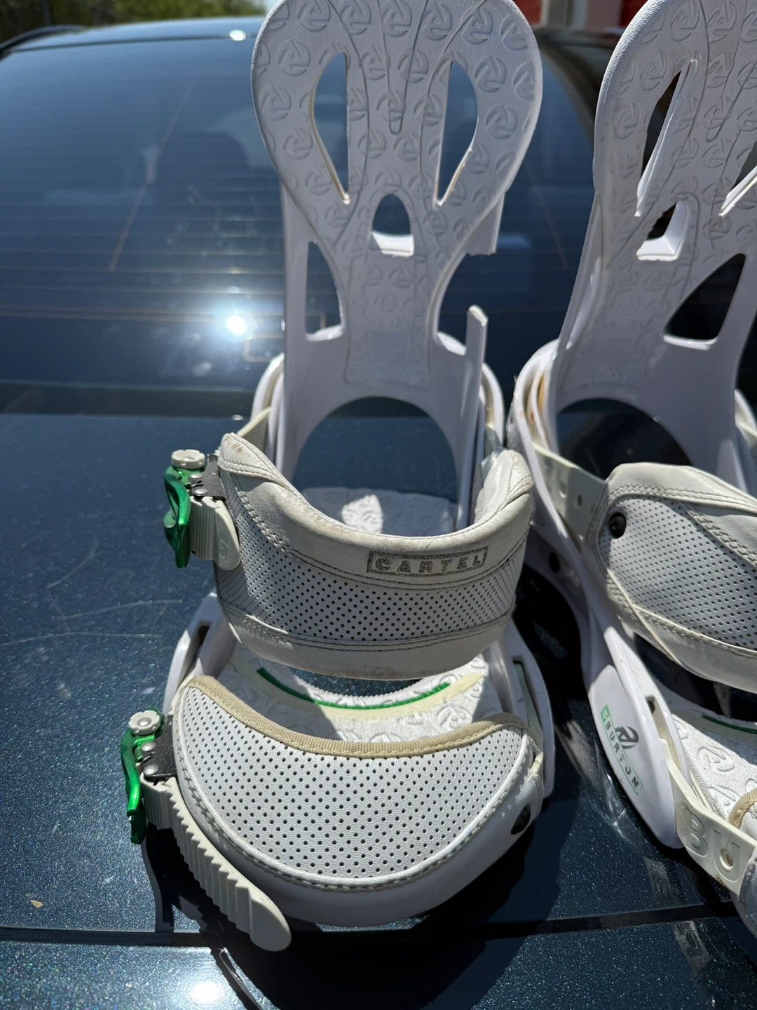 Selling a Burton Custom X 158 Snowboard paired with Cartel bindings. The board and bindings are white.