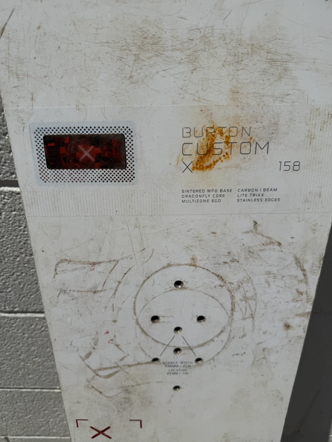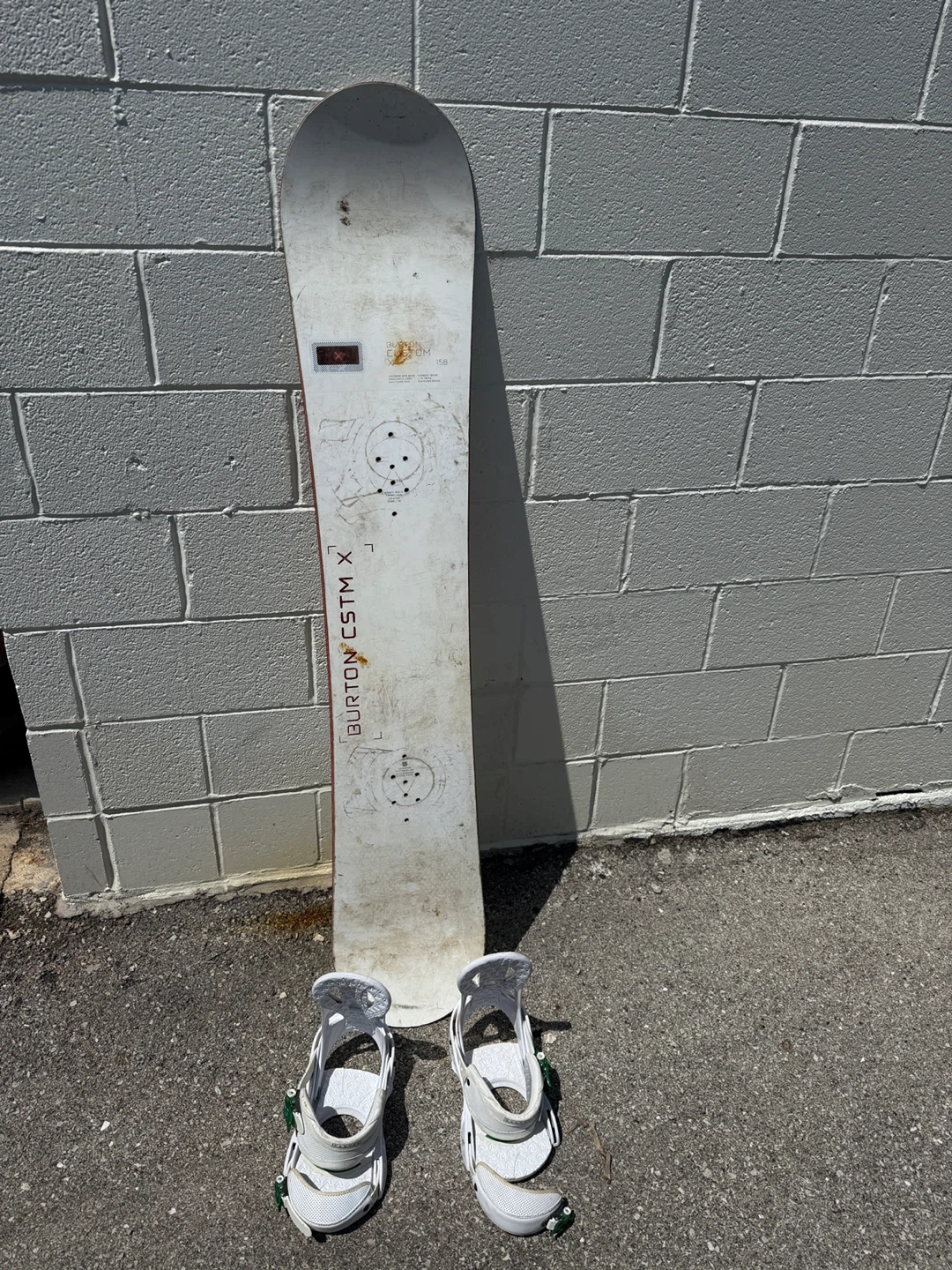 Selling a Burton Custom X 158 Snowboard paired with Cartel bindings. The board and bindings are white.