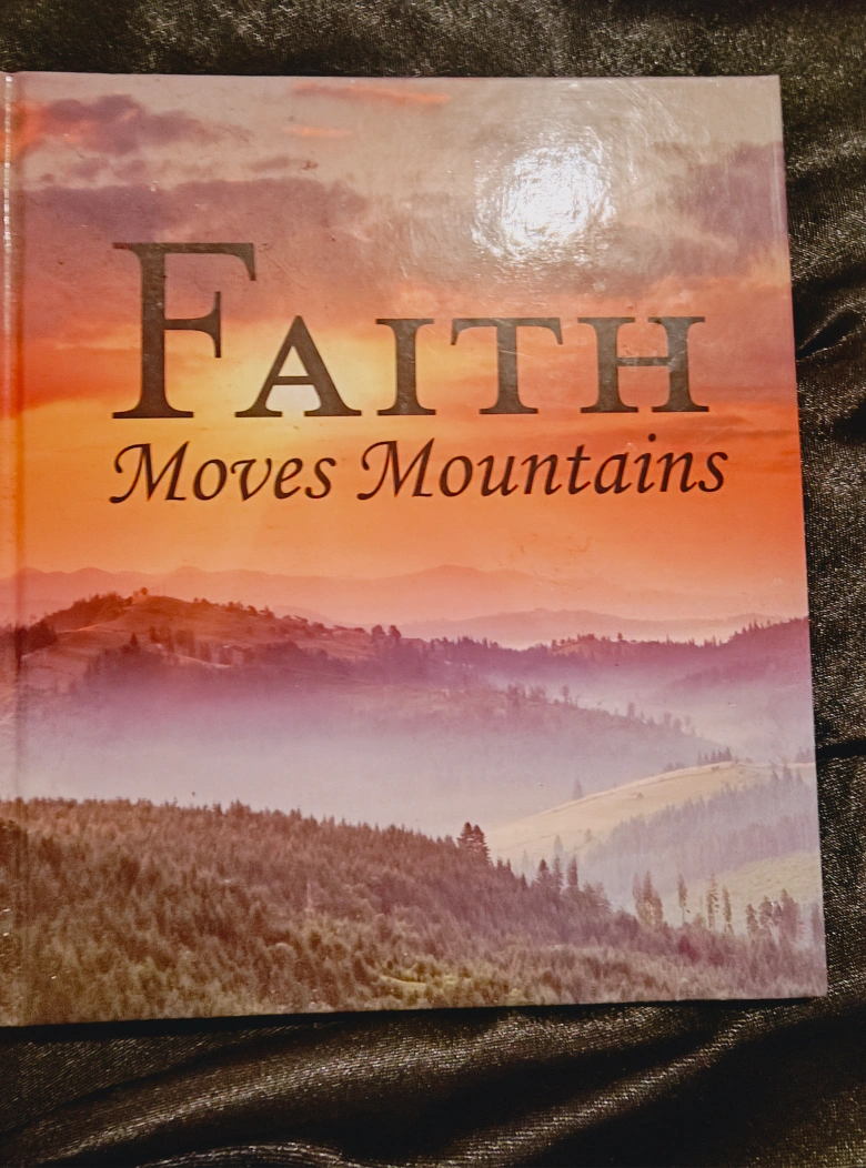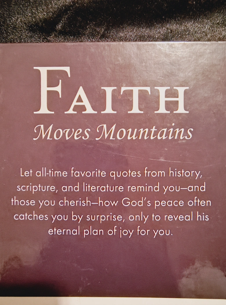 Selling a book titled 'Faith Moves Mountains'! It's a collection of all-time favorite quotes from history, scripture, and literature. This book reminds you and those you cherish how God's peace often catches you by surprise, only to reveal his eternal plan of joy for you