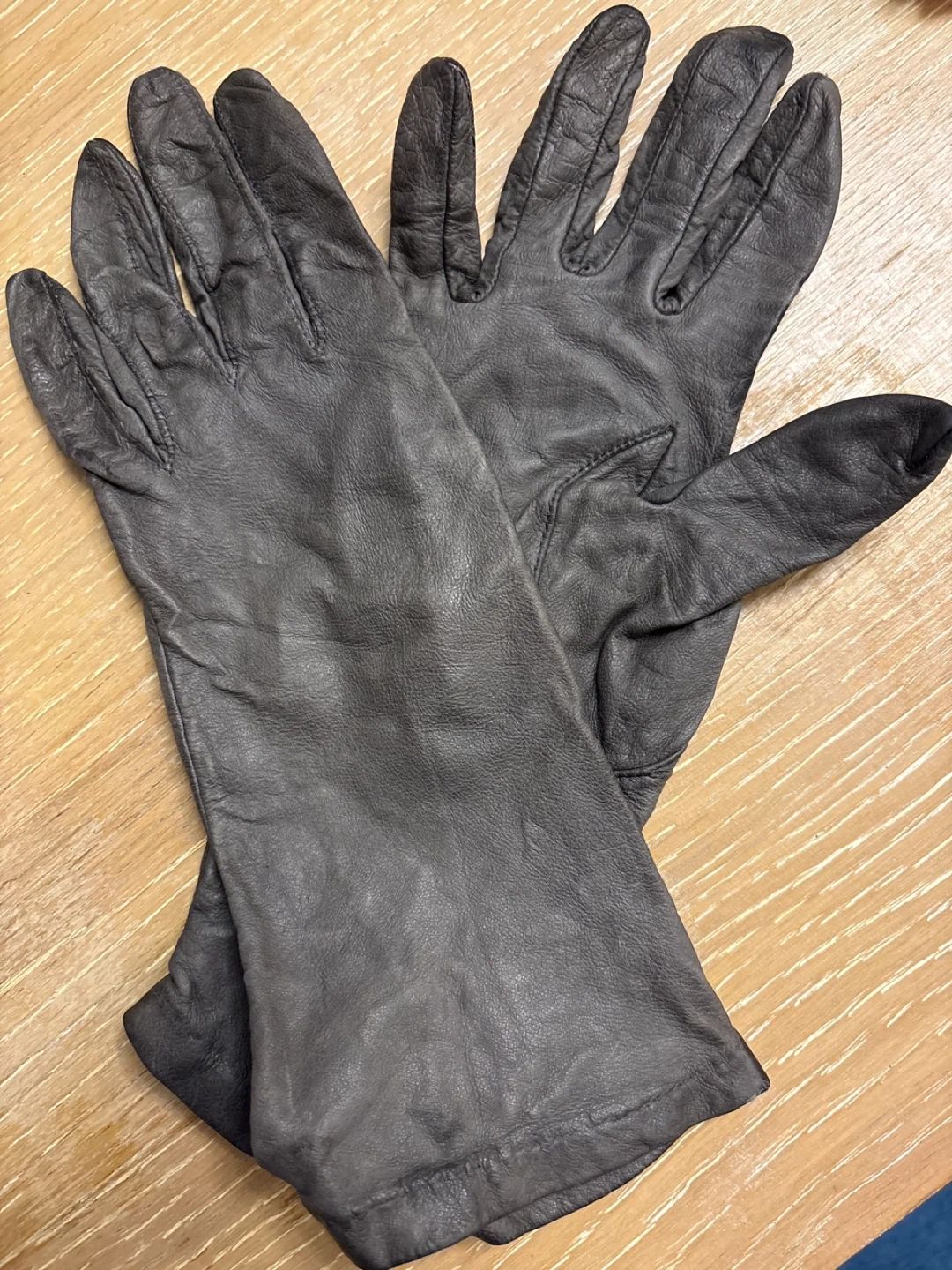 Selling a pair of grey leather gloves. They are in good condition and ready to keep your hands warm! The gloves are made of leather. For small hands, but long fingers.