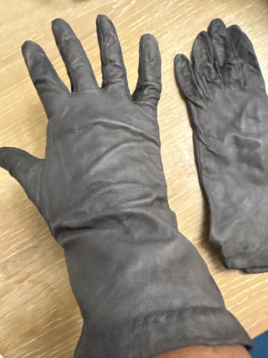 Selling a pair of grey leather gloves. They are in good condition and ready to keep your hands warm! The gloves are made of leather. For small hands, but long fingers.