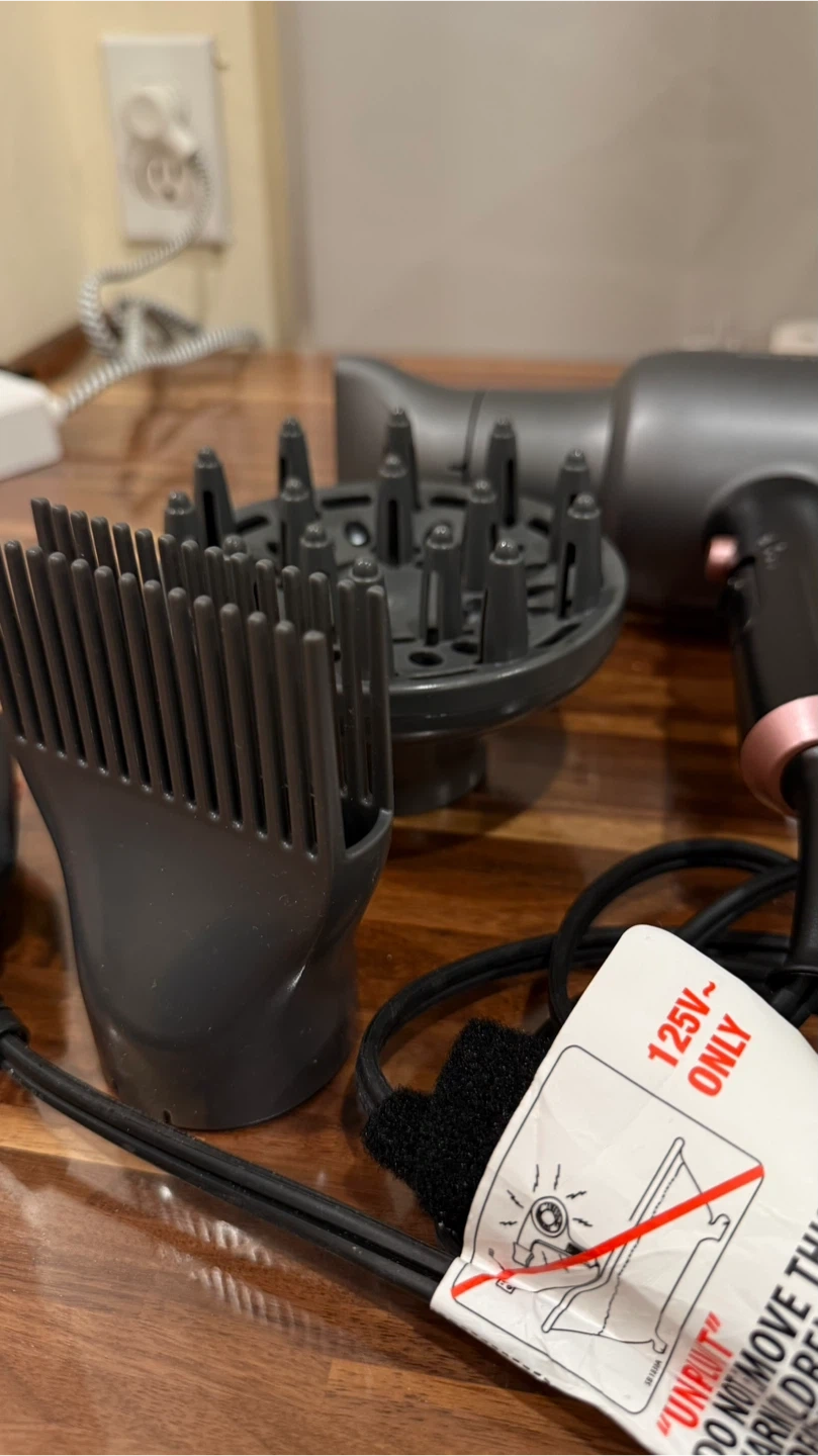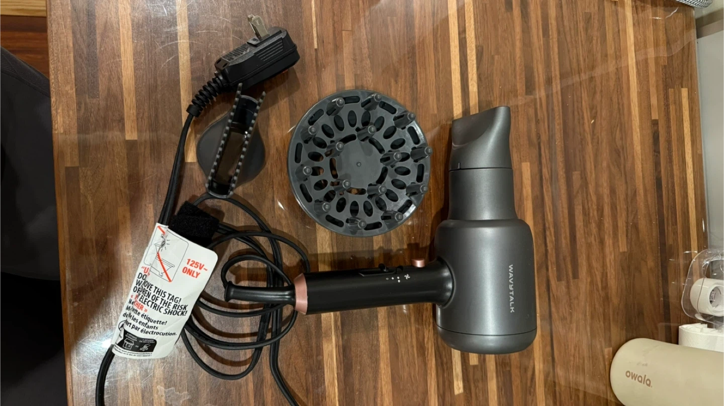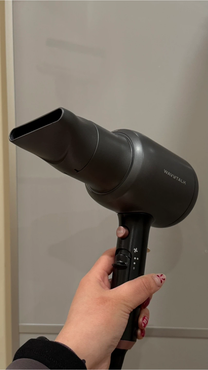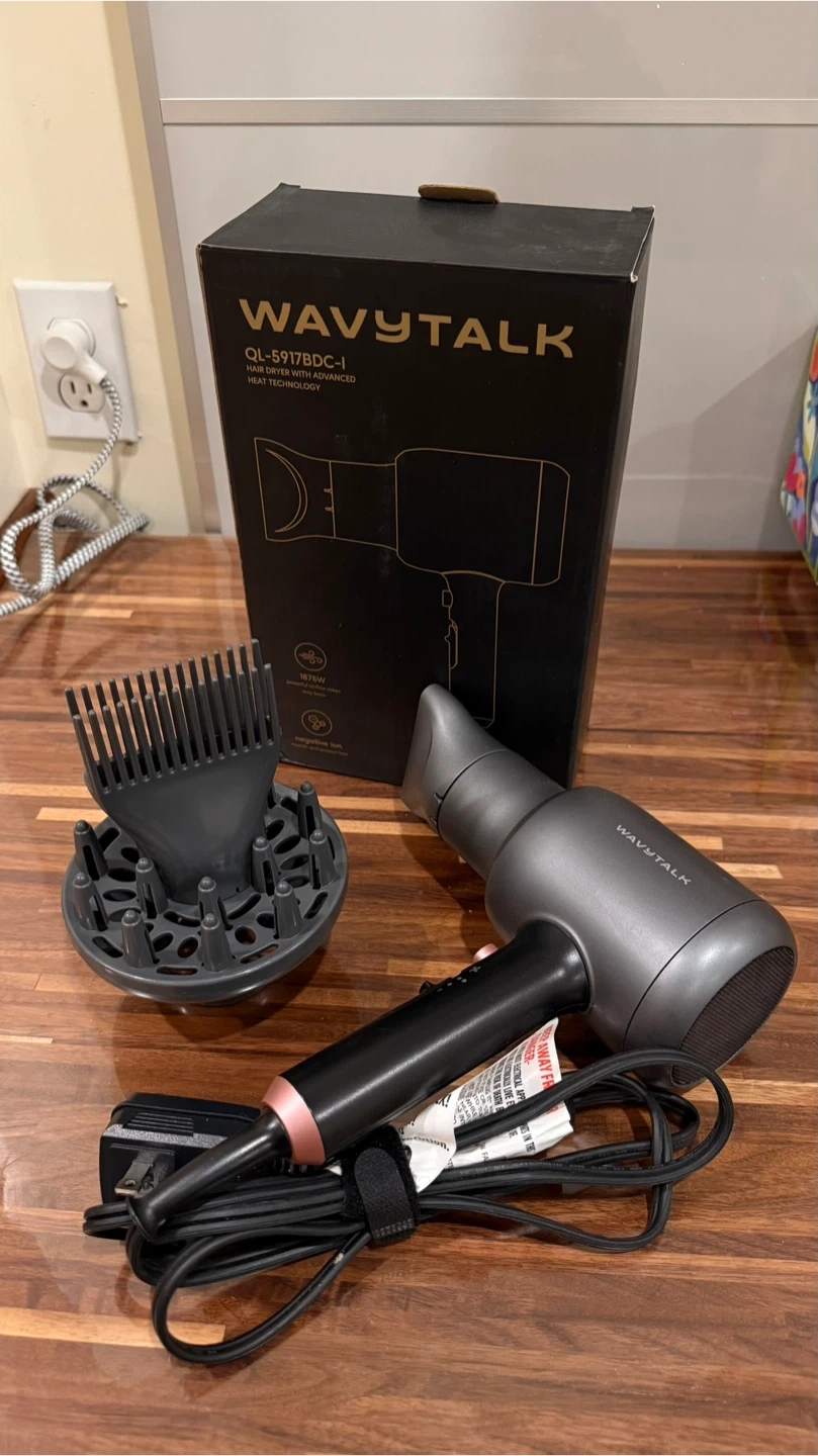 WAVYTALK hair dryer with advanced ionic technology. Includes a concentrator nozzle and diffuser. 1875W power. Plugs into 125V.