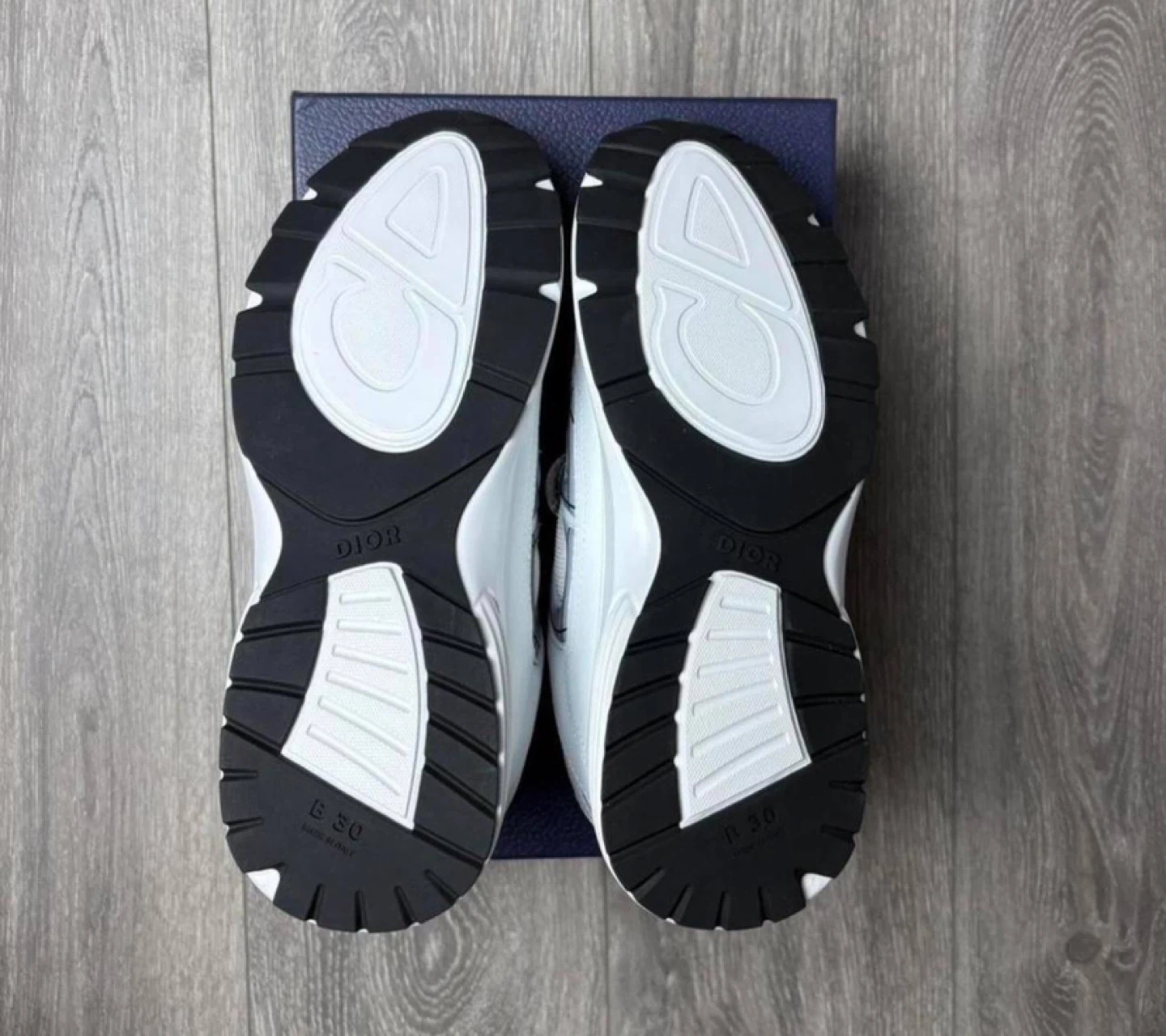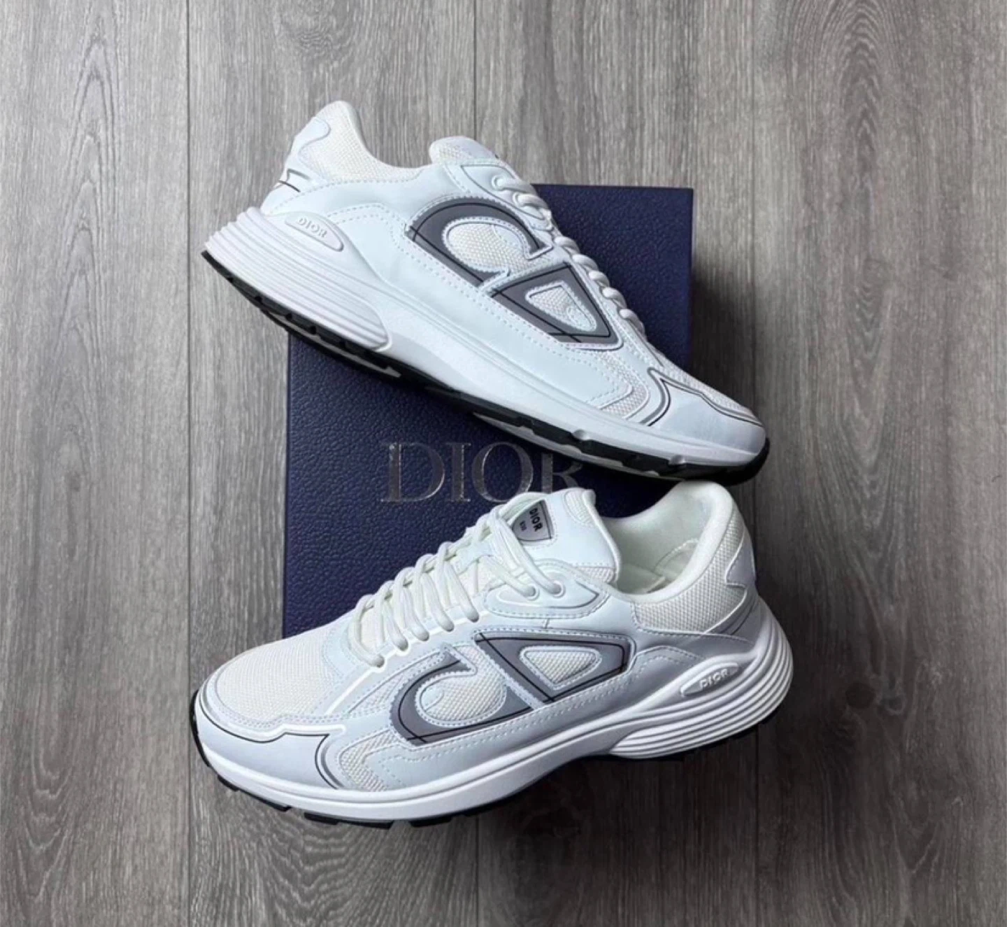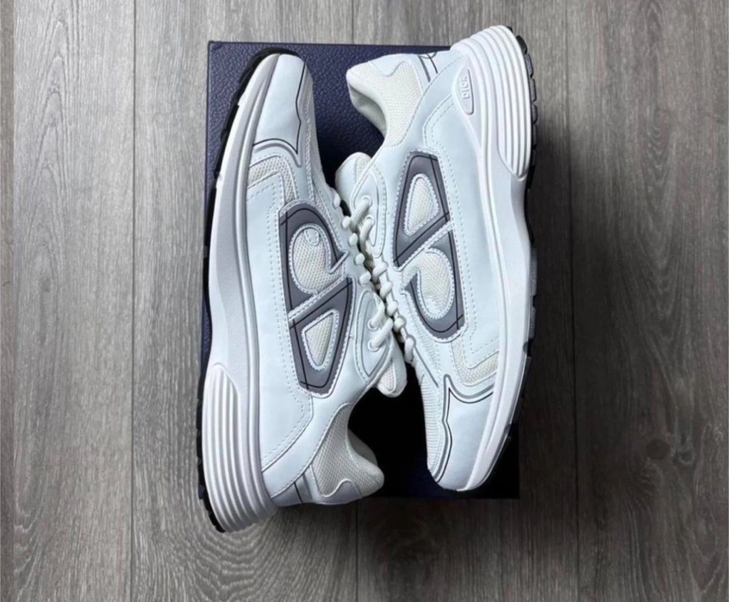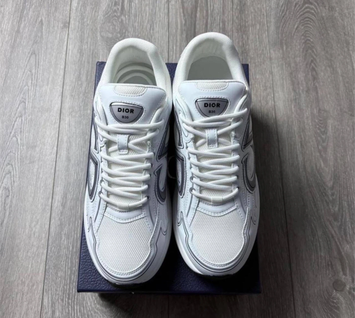 A Clean Pair Of White Dior B30 Sneakers Featuring Premium Mesh And Leather Detailing With Signature CD Branding That Elevates Any Outfit Instantly.
