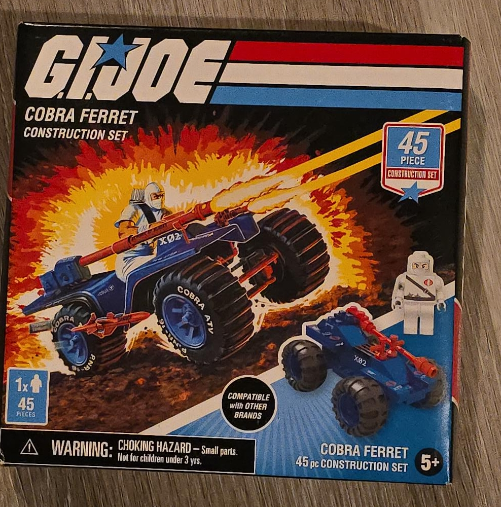 Selling a GI Joe Cobra Ferret construction set! It's a 45-piece set compatible with other brands. The box includes a warning about choking hazards for children under 3 years old. Recommended for ages 5+