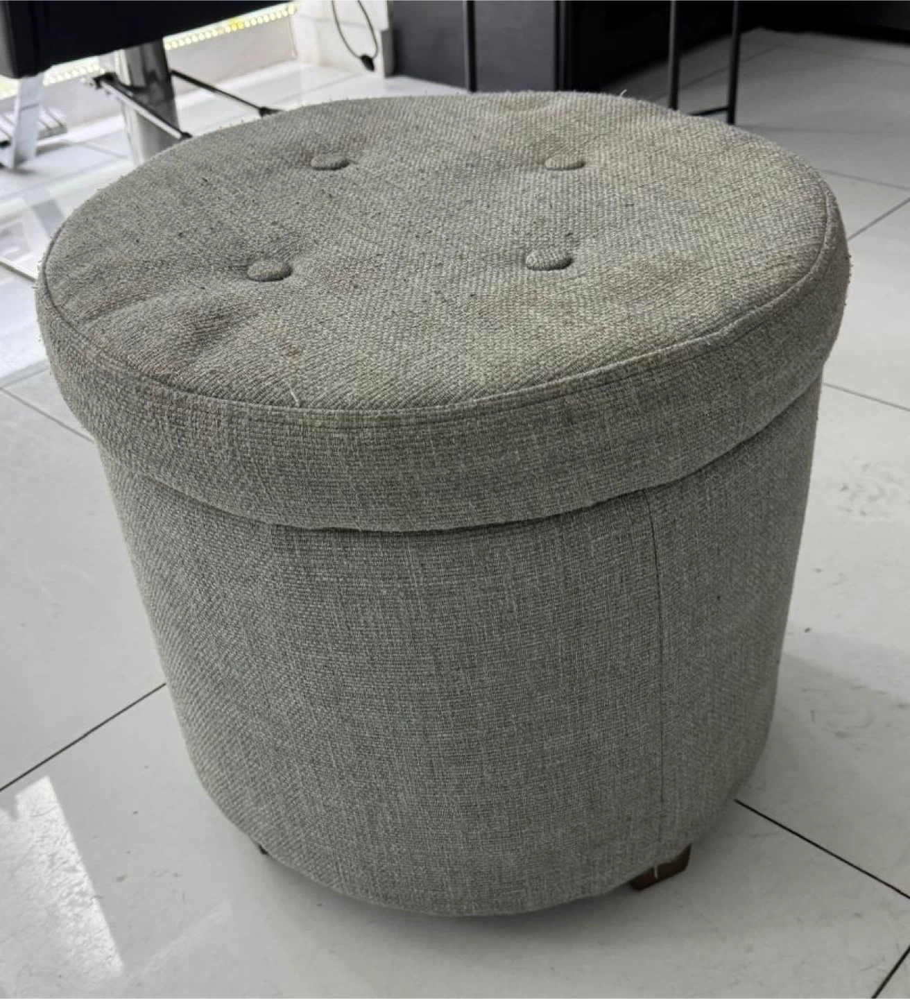 Round storage ottoman with tufted top. Upholstered in a textured gray fabric. Features a lift-off lid for hidden storage. It's great for stashing blankets or other household items!