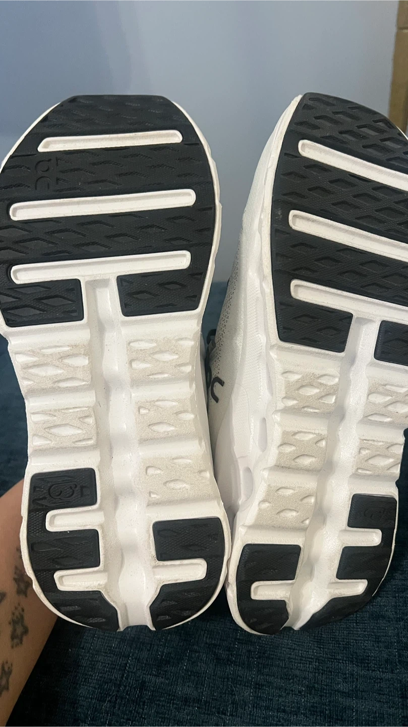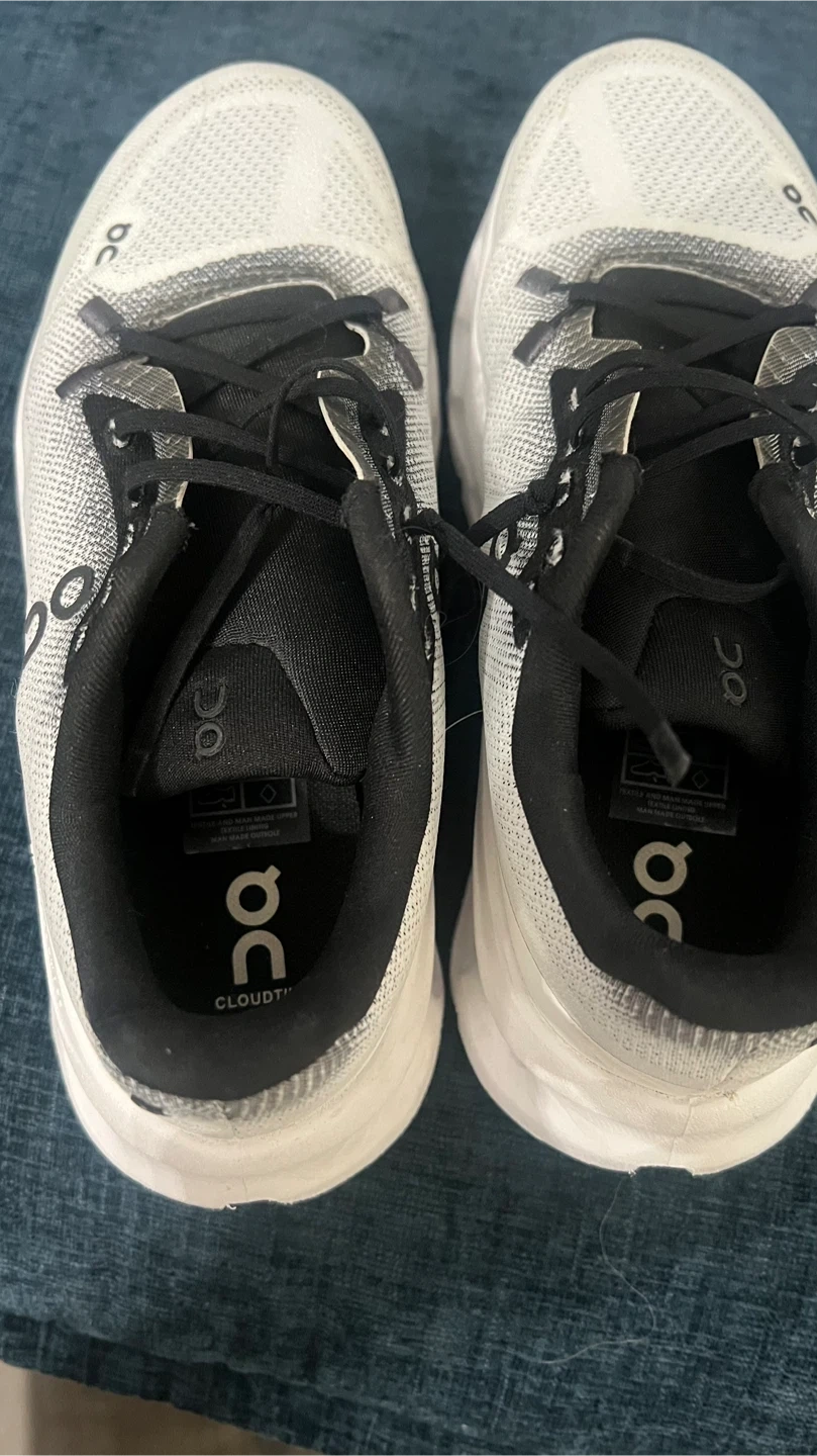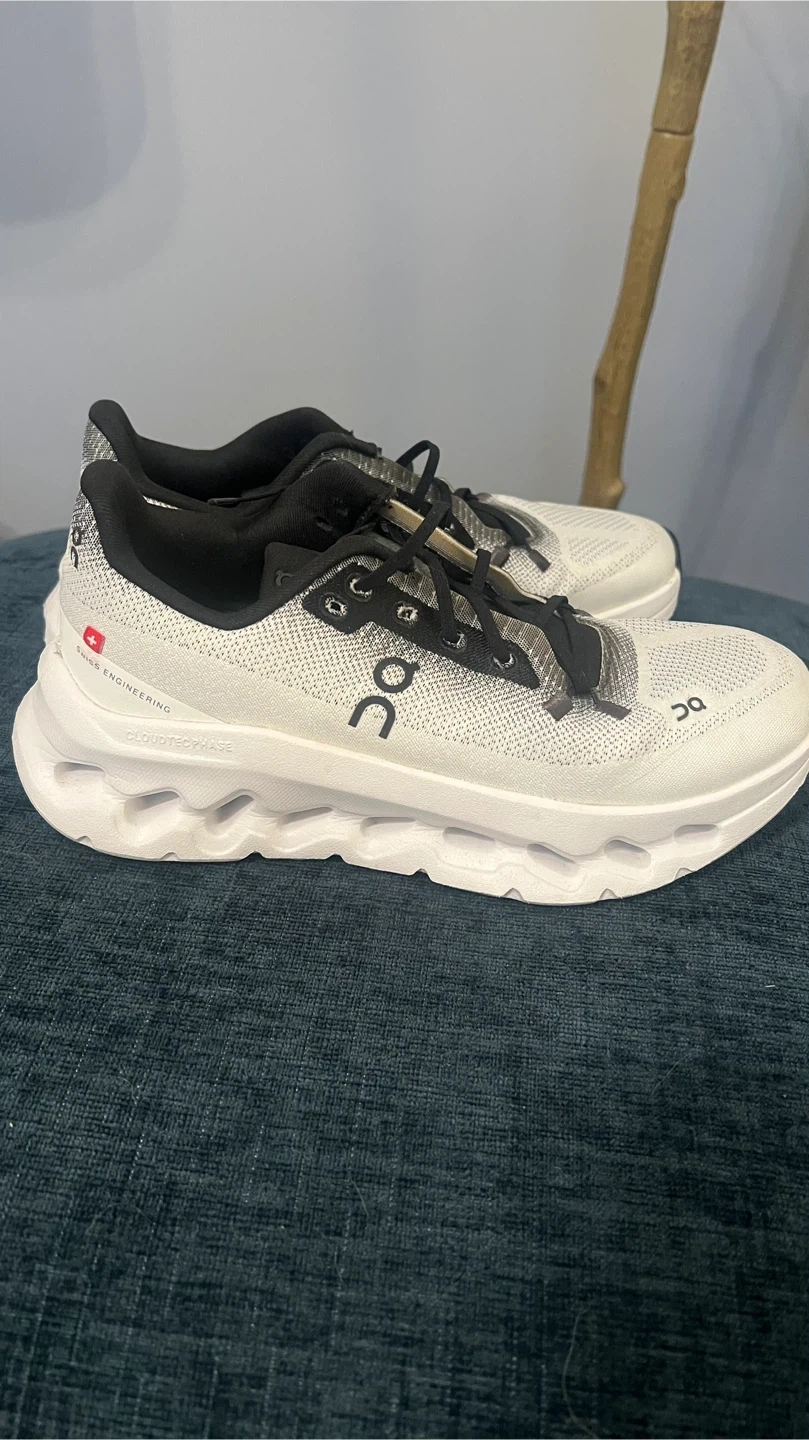 These On Cloudmonster running shoes are white with black accents. They feature a breathable mesh upper and a distinctive sole design. Built for performance running.
