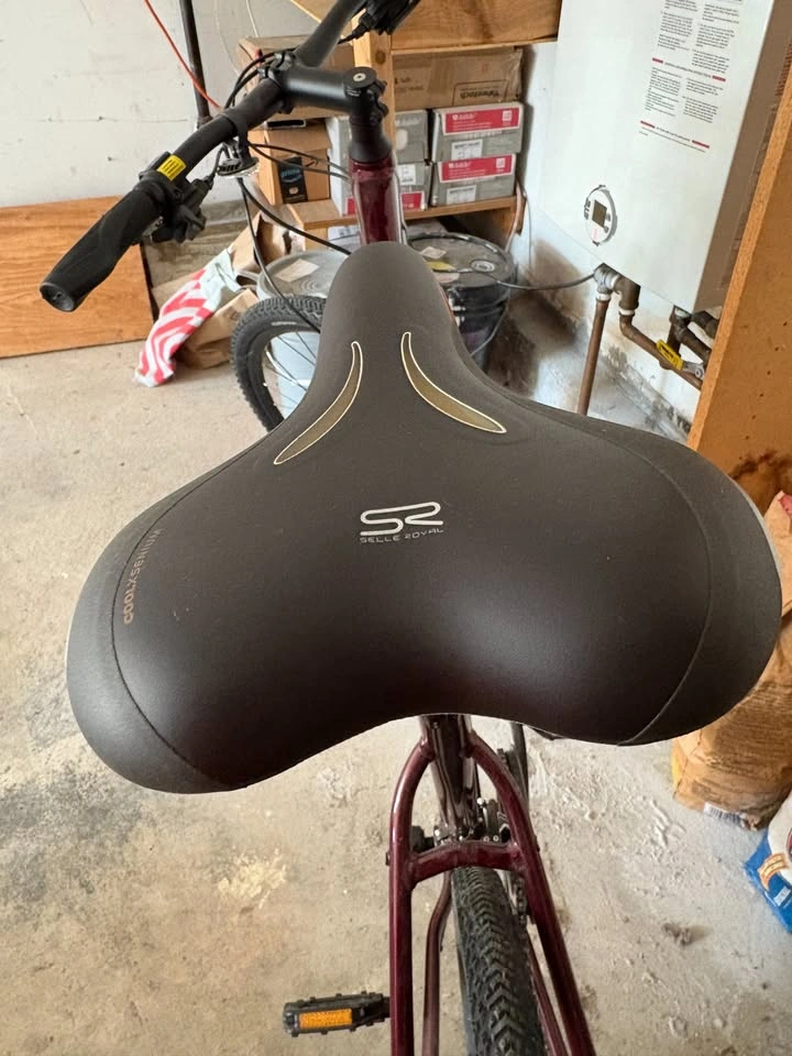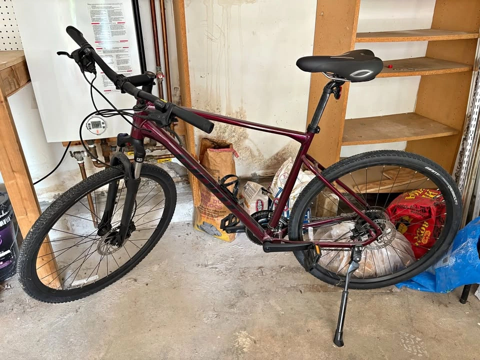 Selling for friend, so answers to questions may take an extra day. Lightly used Giant Roam hybrid bicycle, perfect for both paved roads and light trails. This bike combines the smooth efficiency of a road bike with the strength and comfort of a mountain bike โ ideal for commuting, weekend rides, or fitness. Features: Model: Giant Roam (Burgundy Red frame) Frame Size: Medium (fits most riders 5โ6โโ6โ0โ) Gears: Shimano Acera drivetrain โ smooth, reliable shifting Brakes: Front and rear disc brakes for confident stopping power Tires: Giant Crosscut Hybrid 700x42c tires โ great grip on pavement or trails Front Suspension Fork: Suntour fork for extra comfort on bumps Seat: Upgraded Selle Royal gel comfort saddle Accessories: Includes water bottle holder, kickstand and a bicycle roller/trainer so you can ride inside when the weather is not cooperating. Condition: Excellent mechanical and cosmetic shape. Rides great โ gears shift smoothly, brakes are strong, and tires have plenty of tread. Always stored indoors and well cared for. Price: ๐ฒ600 Pickup in: Roslyn Heights, NY