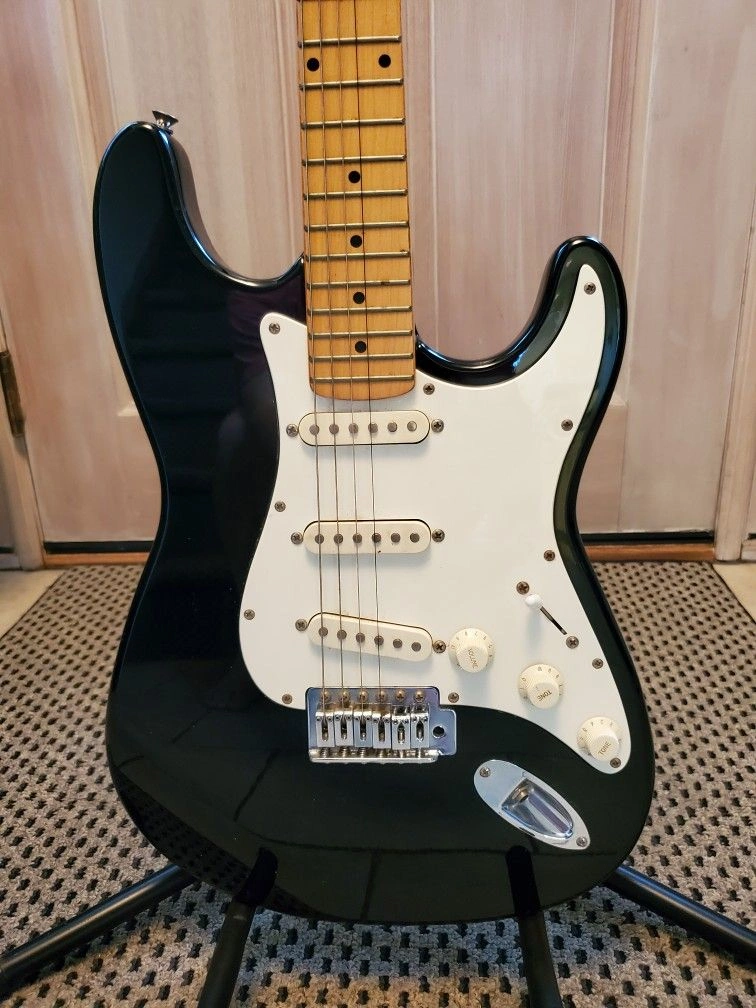 Guitar Trades Considered Vintage 1996 Epiphone S-310 Batwing Stratocaster - Made In Korea In excellent condition for a 28 year old guitar, needs a new set of strings Body: Laminated alder body Neck: Maple Neck Maple Fingerboard with dot inlays 25.5" scale 1.68" nut width Headstock: Batwing headstock Electronics: 3 Epiphone single coil pickups 1 Vol. 2 Tone controls 3-way Selector Switch Hardware: Chrome Hardware 2-Point Fulcrum tremolo White pickguard White top-hat knobs Body Color: Black Size: 4/4 Right Or Left Handed: Right-handed Type: Electric Brand: Gibson Epiphone
