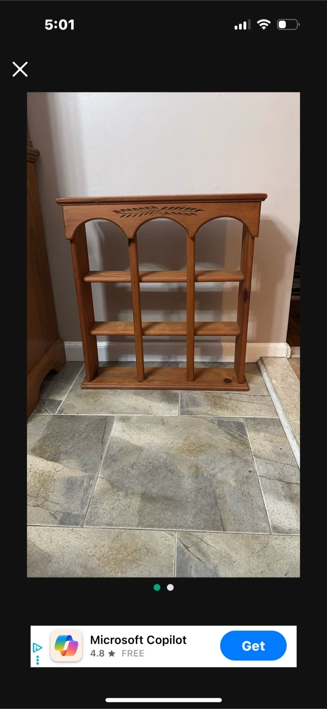 Selling a solid oak wooden shelf. It has three shelves and a decorative design on top. It's in good condition and ready for a new home!